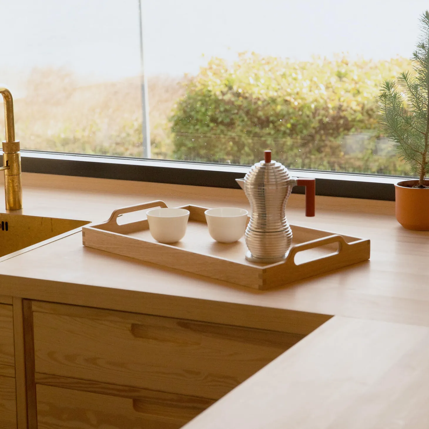 KA10 bakken er den perfekte løsning til en bred vifte af formål, lige fra at servere forfriskninger på terrassen til at være en praktisk hjælp ved borddækningen i hverdagen. Vores serveringsbakke er designet med enkelhed i tankerne, og den trækker inspiration fra den stolte danske snedkertradition, hvilket afspejles i de tapsamlinger, der tilføjer ekstra styrke. Træet, der anvendes til at skabe disse bakker, er europæisk egetræ af bedste kvalitet. Dette sikrer ikke blot et smukt udseende, men også en holdbar og pålidelig konstruktion. Bakken er behandlet med den samme mat møbellak som vores populære kopkasser. Denne specielle behandling sikrer ikke kun en smuk overflade, men også øget modstand mod daglig brug, hvilket er afgørende, især når bakken bruges til servering af snacks og drikke, hvor der kan opstå spild og pletter. KA10 bakken har vist sig at være en stor succes i restaurationsbranchen, hvilket vidner om dens alsidighed og pålidelighed. Giv din servering et strejf af dansk design med KA10 bakken, der er designet til at imødekomme både praktiske og æstetiske behov.