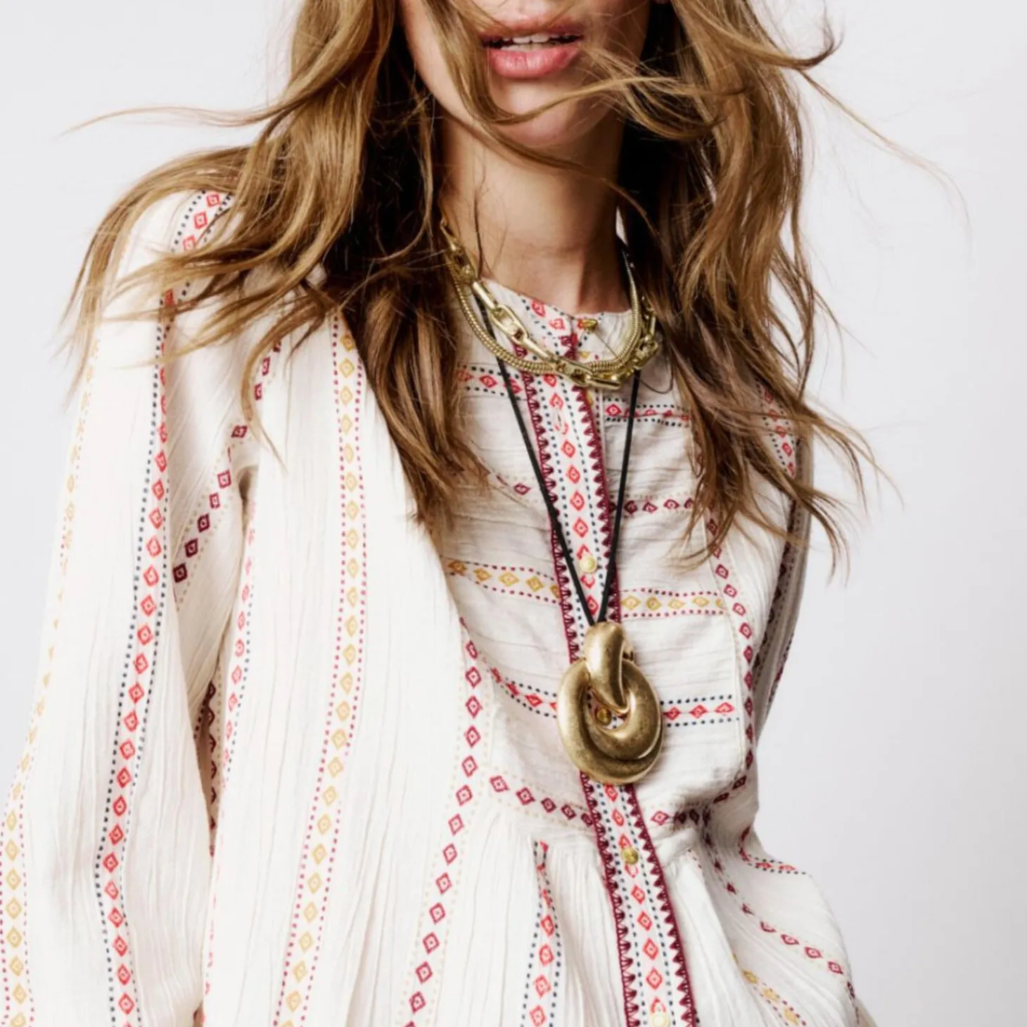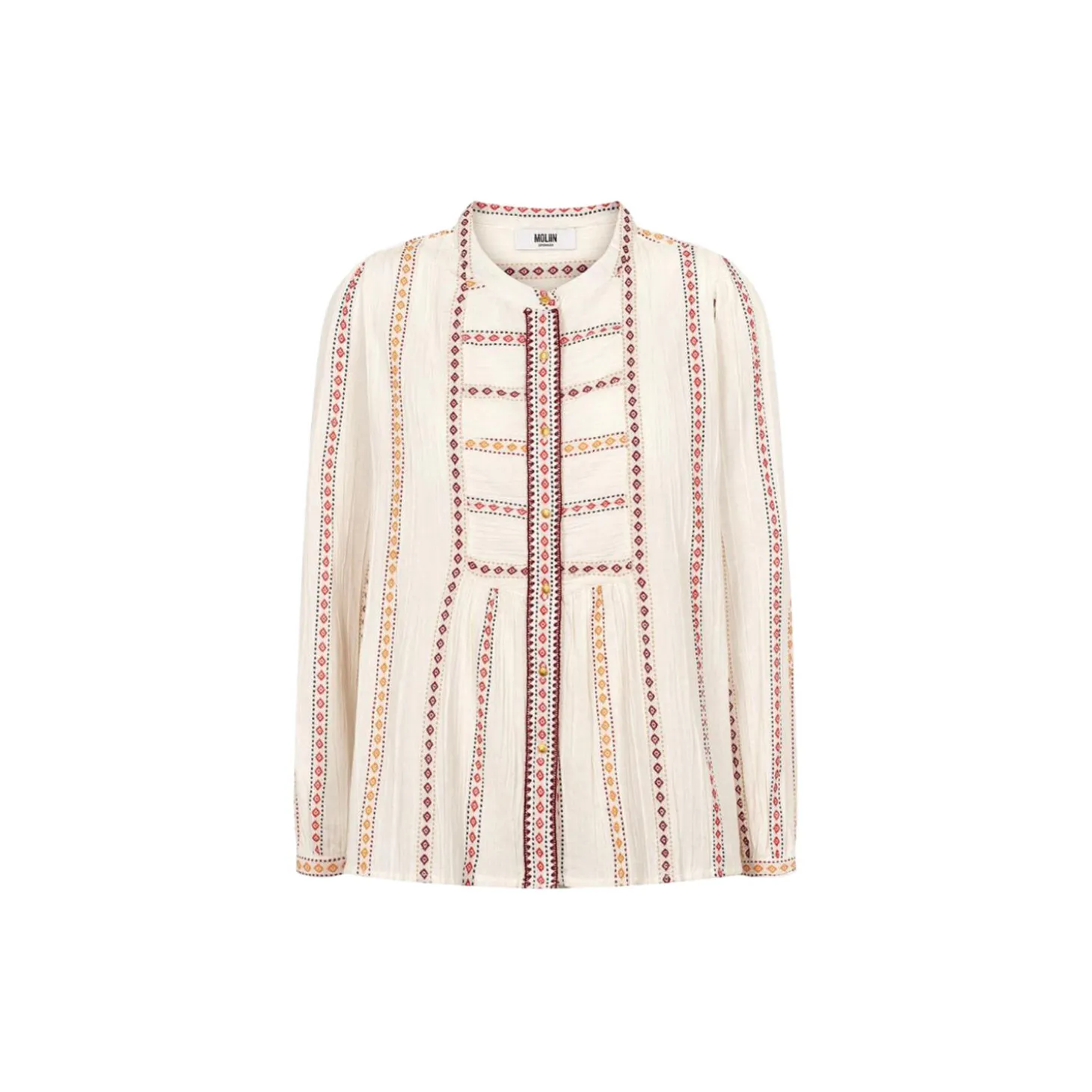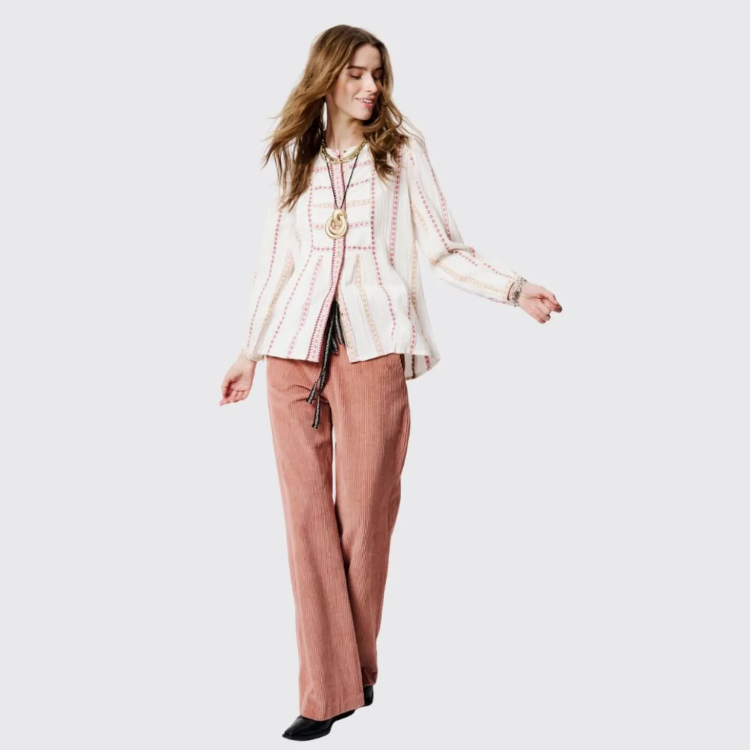Skjorte med et folkeinspireret stribet mønster af broderede kanter i varme toner. Skjorten har en rund halsudskæring og guldknapper foran. Kvalitet: 100% bomuld.