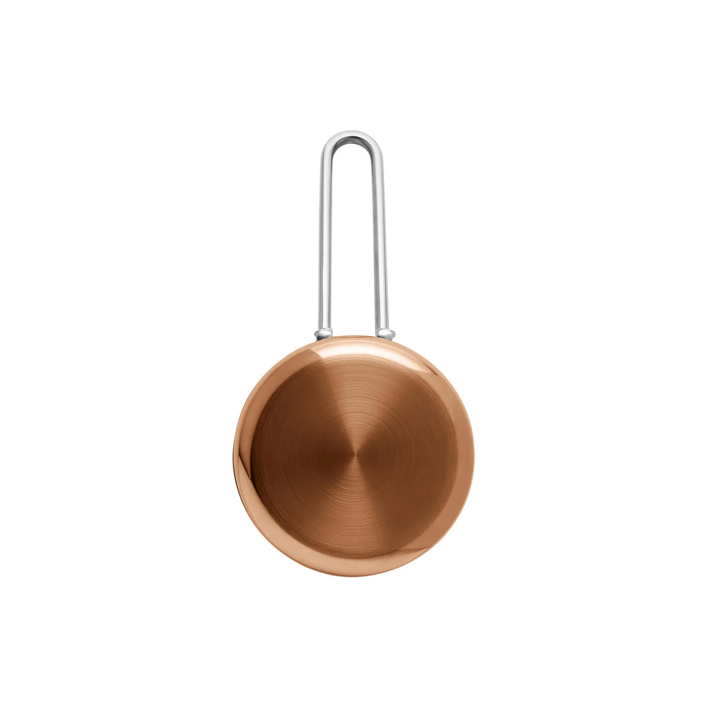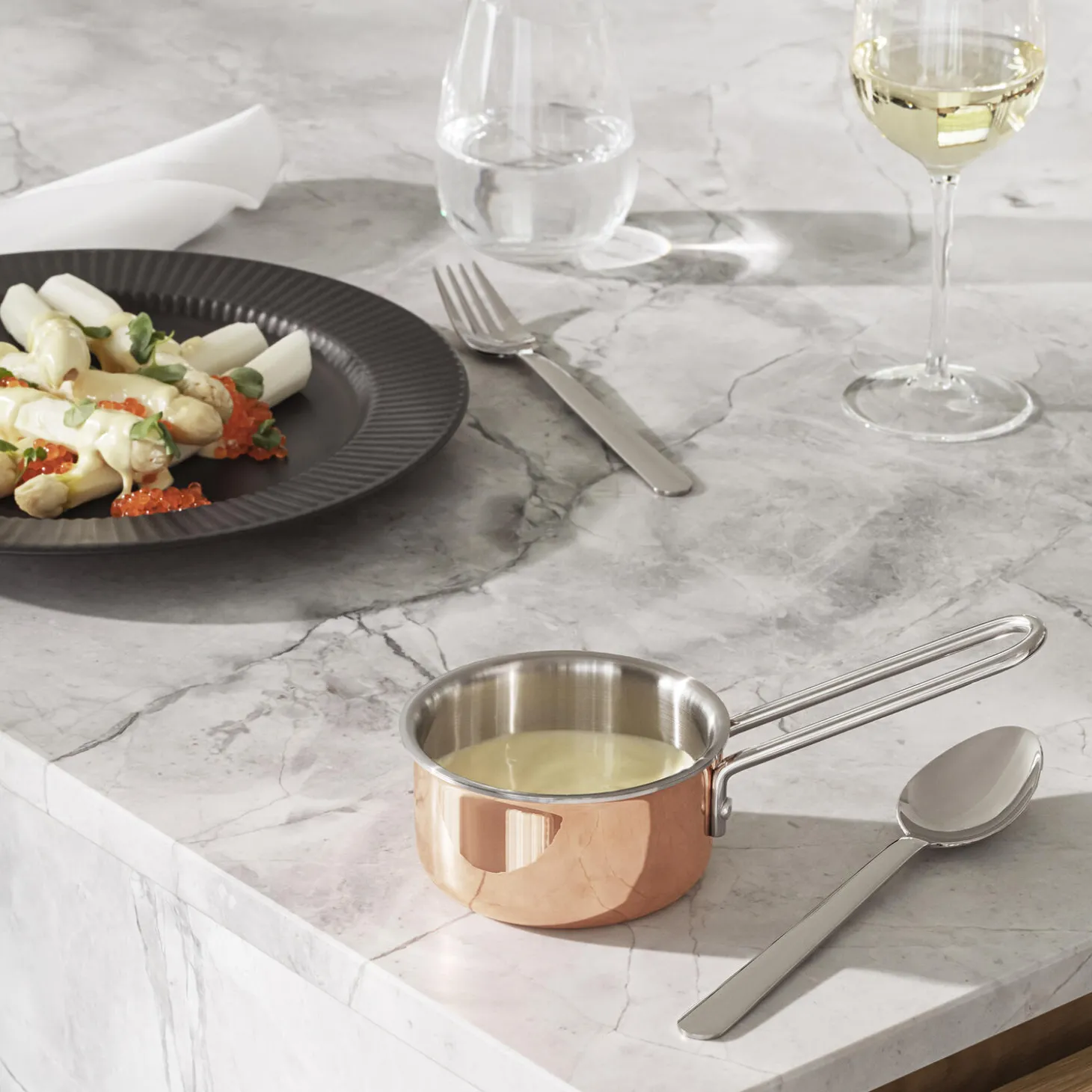 Den dekorative serveringskasserolle egner sig perfekt til at fremvise små retter, saucer eller tilbehør. Kasserollen er fremstillet af kobber og rustfrit stål. Kobber er en fremragende varmeleder, så indholdet holder den rette temperatur. Det rustfri stål på inderside gør det muligt at anvende stålredskaber, som f.eks. til omrøring af sauce før servering, uden at skade belægningen. Bemærk, kasserollen er designet udelukkende til servering og bør ikke bruges til madlavning.