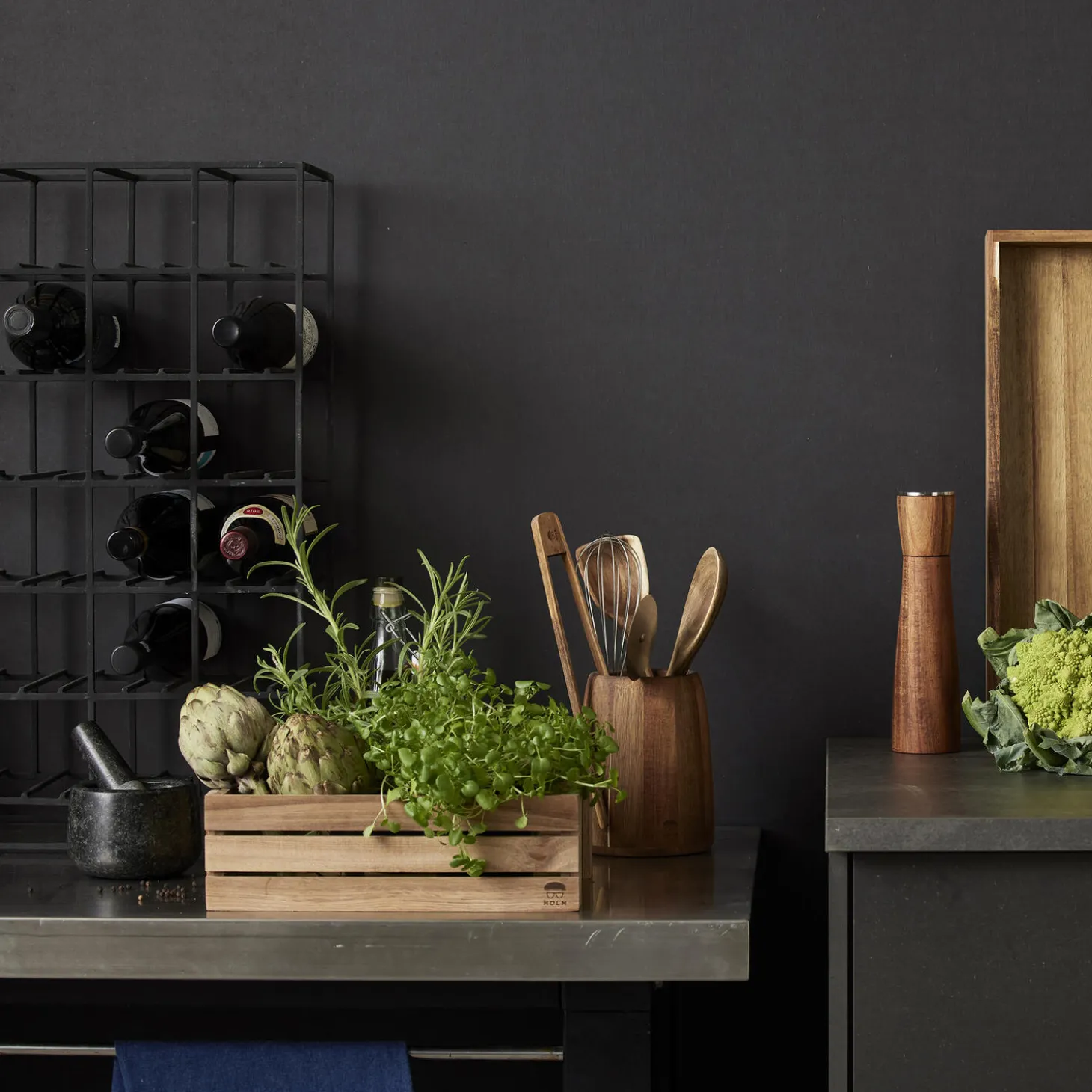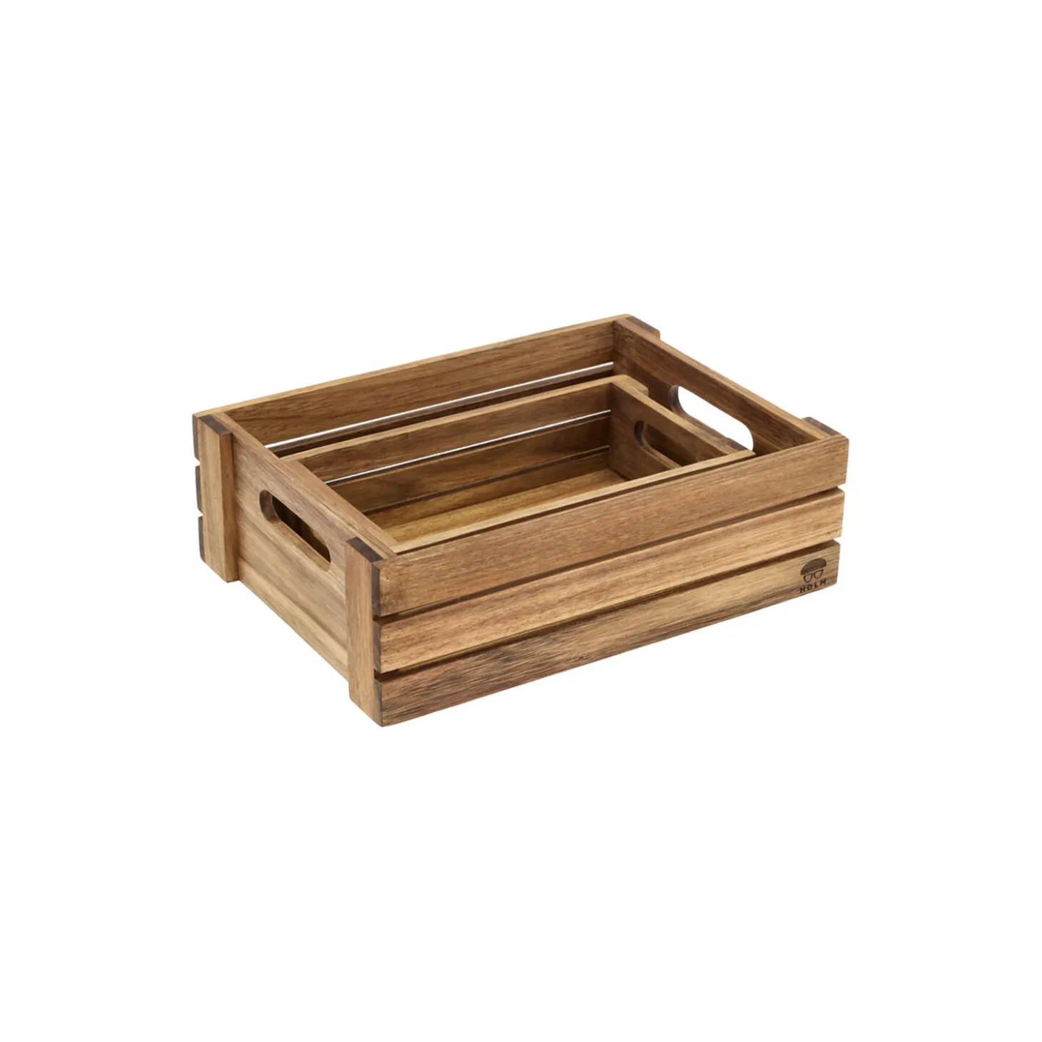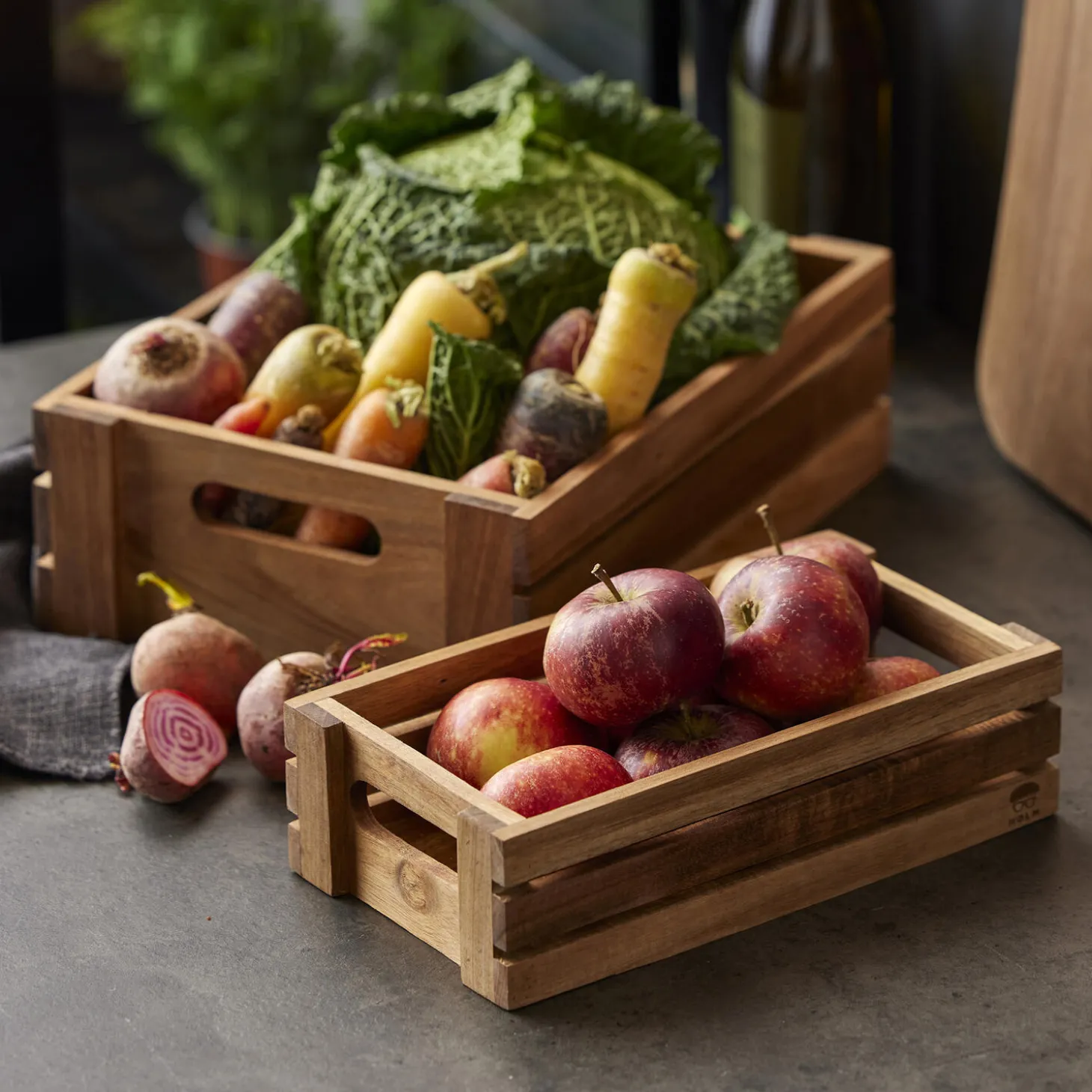 Du kan bruge de flotte trækasser i to størrelser til opbevaring af mange forskellige ting, f.eks. olier, krydderier og krydderurter i køkkenet, til køkkenredskaber eller servietter. Akacietræet med de smukke åretegninger kan med fordel efterbehandles med smagsneutral olie et par gange om året. Den lille kasse måler 26 x 14 x 7 cm, og den store måler 32 x 23 x 10 cm. Kasserne tørres over med en fugtig klud og må ikke vaskes i opvaskemaskine.Varen er produceret i FSC®-certificeret akacietræ (FSC-C166612).
