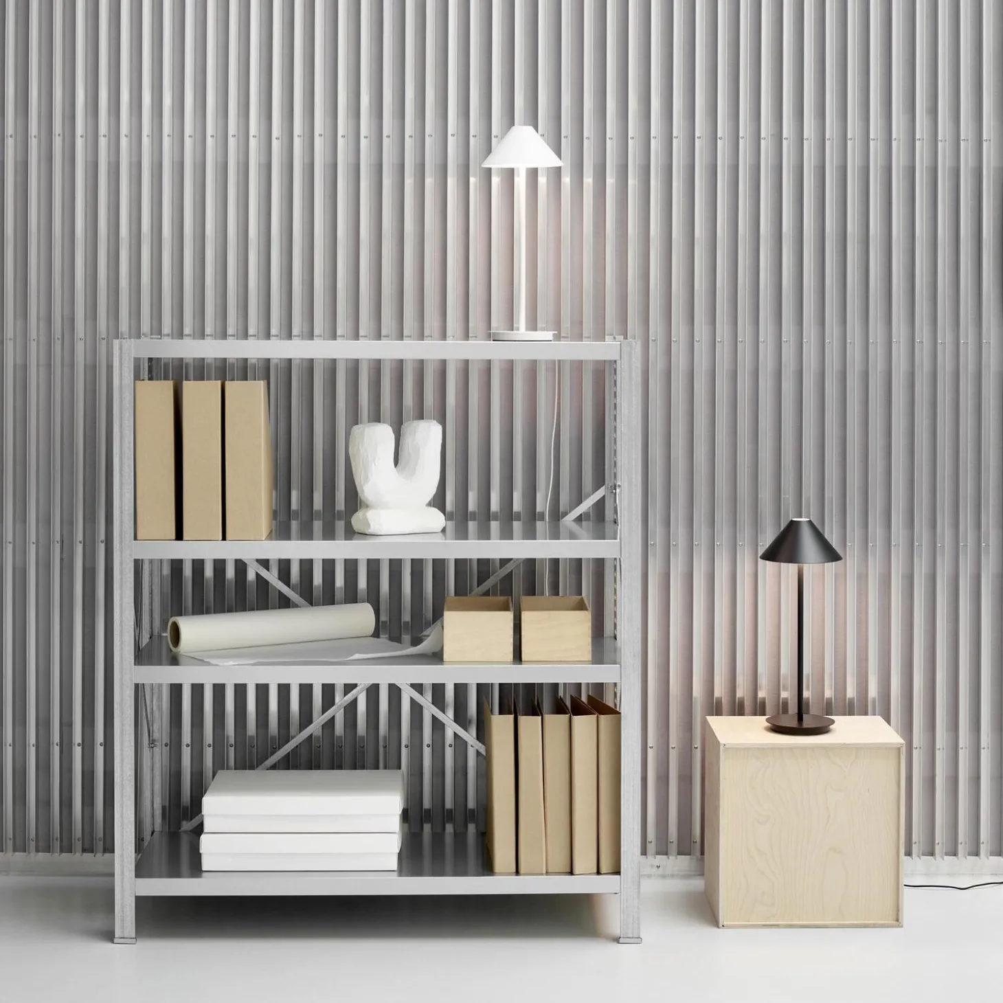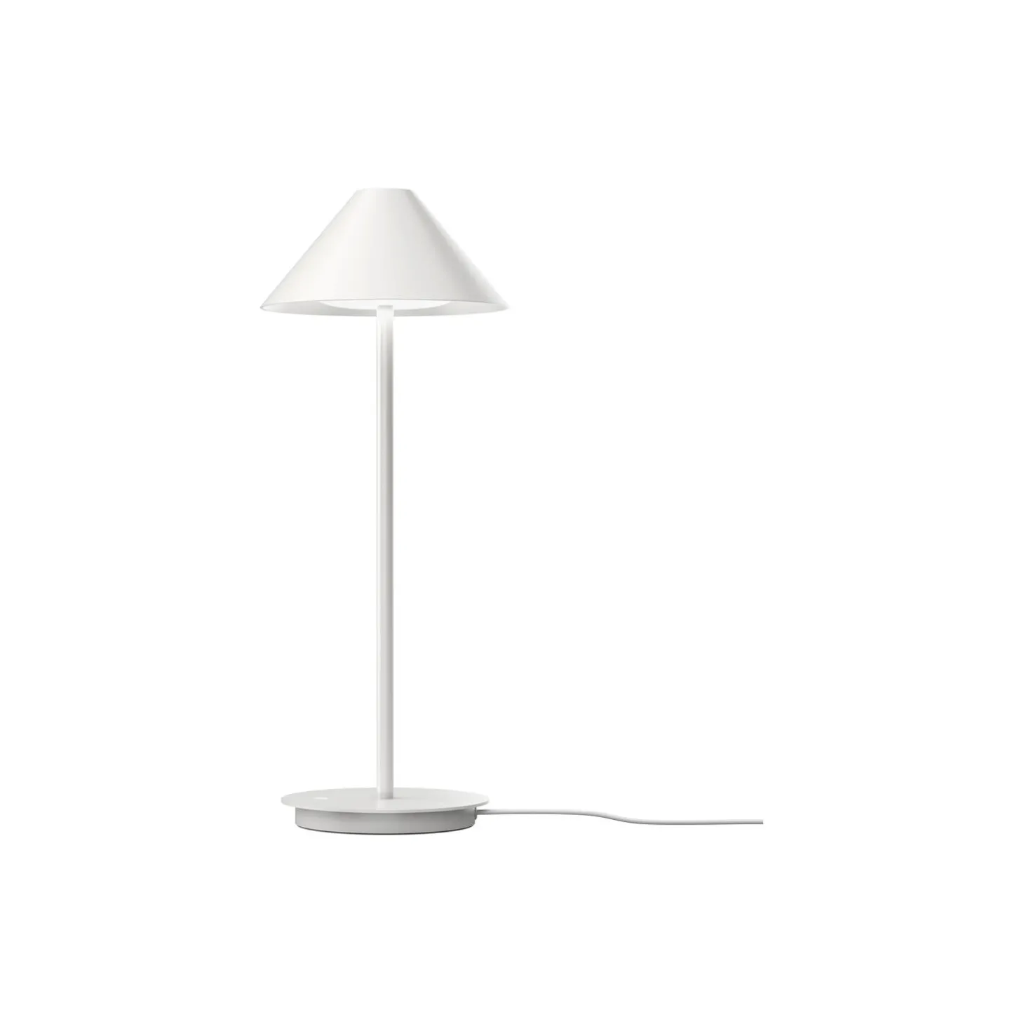 Keglen bordlampe med skærm i optrukket aluminium, diffusor i sprøjtestøbt polykarbonat og fod i forarbejdet trykstøbt aluminium fra Louis Poulsen. Farve: hvid. Mål: H: 44 x L: 17,5 x B: 17,5 cm. Lyskilde: 8,5W LED 2700-2000K D2W. Design: Big Ideas. Keglen blev designet i 2019 som en opfølgning på Louis Poulsen og BIG Ideas’ første samarbejde i 2017, som resulterede i en pendel til Tirpitz Museum i Blåvand – en bygning, BIG har designet til Varde Museerne. Hovedformålet med Keglen var at skabe et systematisk designsprog, der gav mulighed for en bredere vifte af belysningstypologier. BIG Ideas ønskede en hel familie af lamper med de samme kvaliteter og designdetaljer, i forskellige størrelser og hver med sin egen unikke personlighed. Keglens koniske skærme har en karakteristisk buet afskærmning, som minder om en vanddråbe og sikrer en attraktiv, blændfri nedadrettet belysning. Skærmenes hvide inderside reflekterer lyset perfekt. En diskret ensartet åbning øverst i hver skærm udsender et blidt og stemningsskabende opadrettet lys.