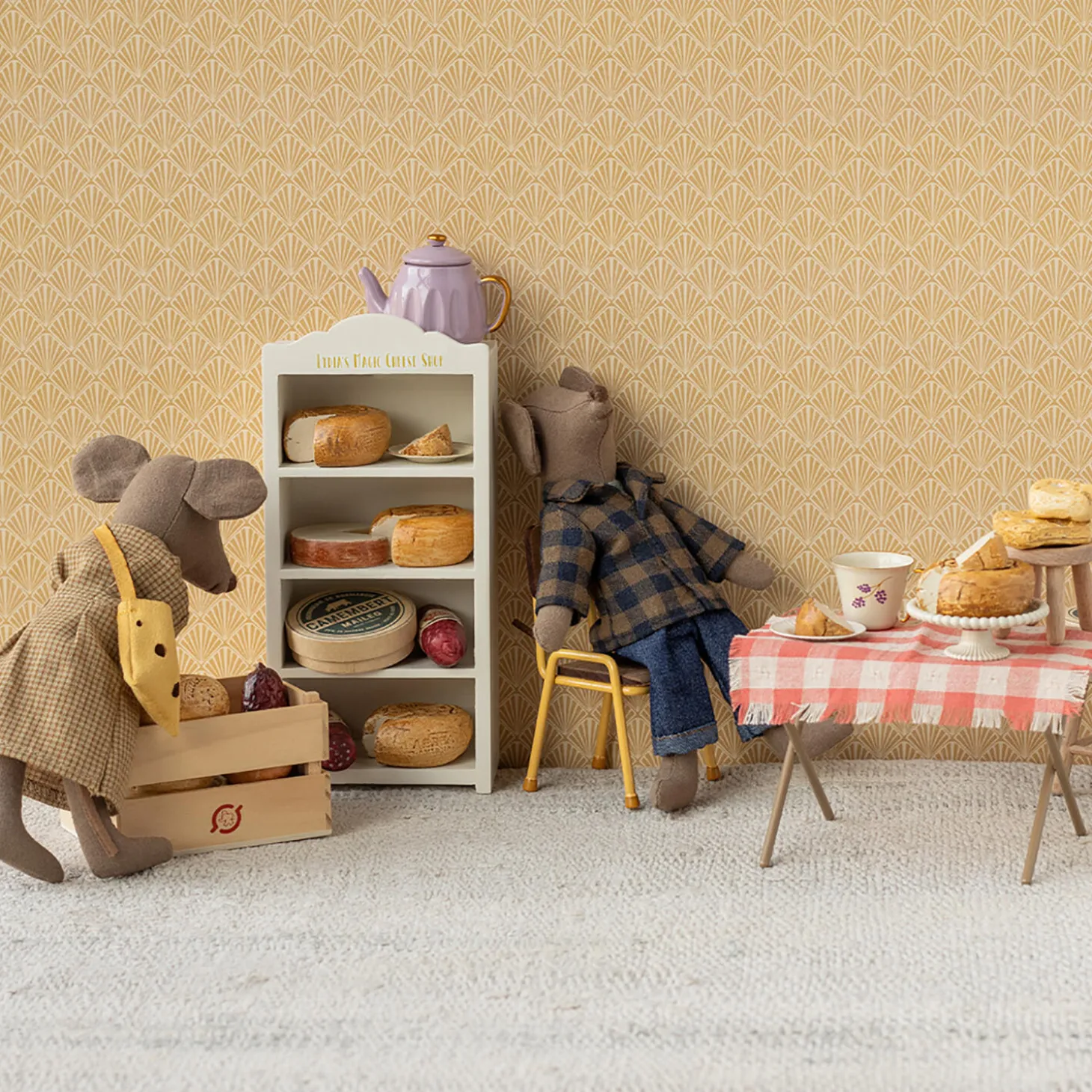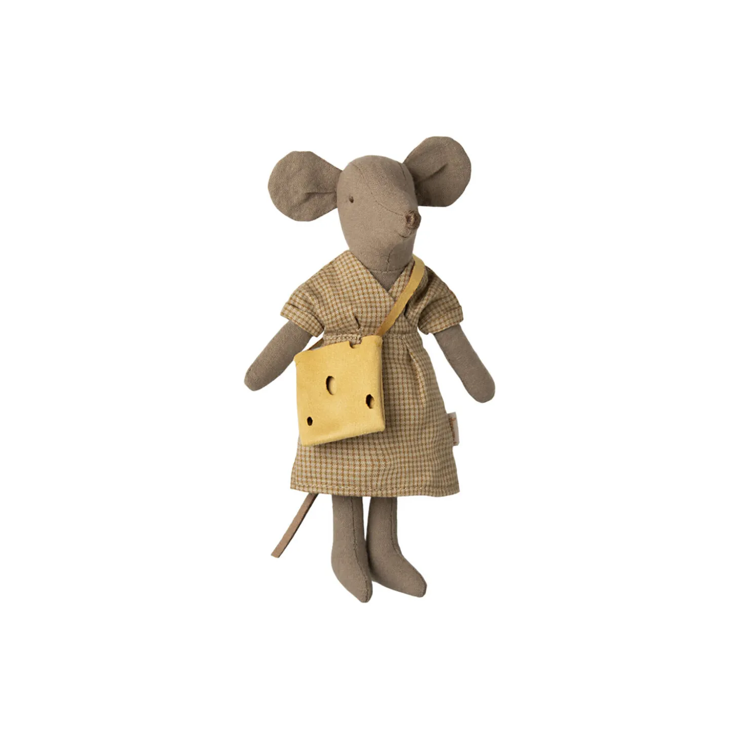 Hvis du har brug for et nyt sæt tøj til din mus, er dette sæt et godt valg. Sættet består af en kjole i små tern og en taske med ostehuller.