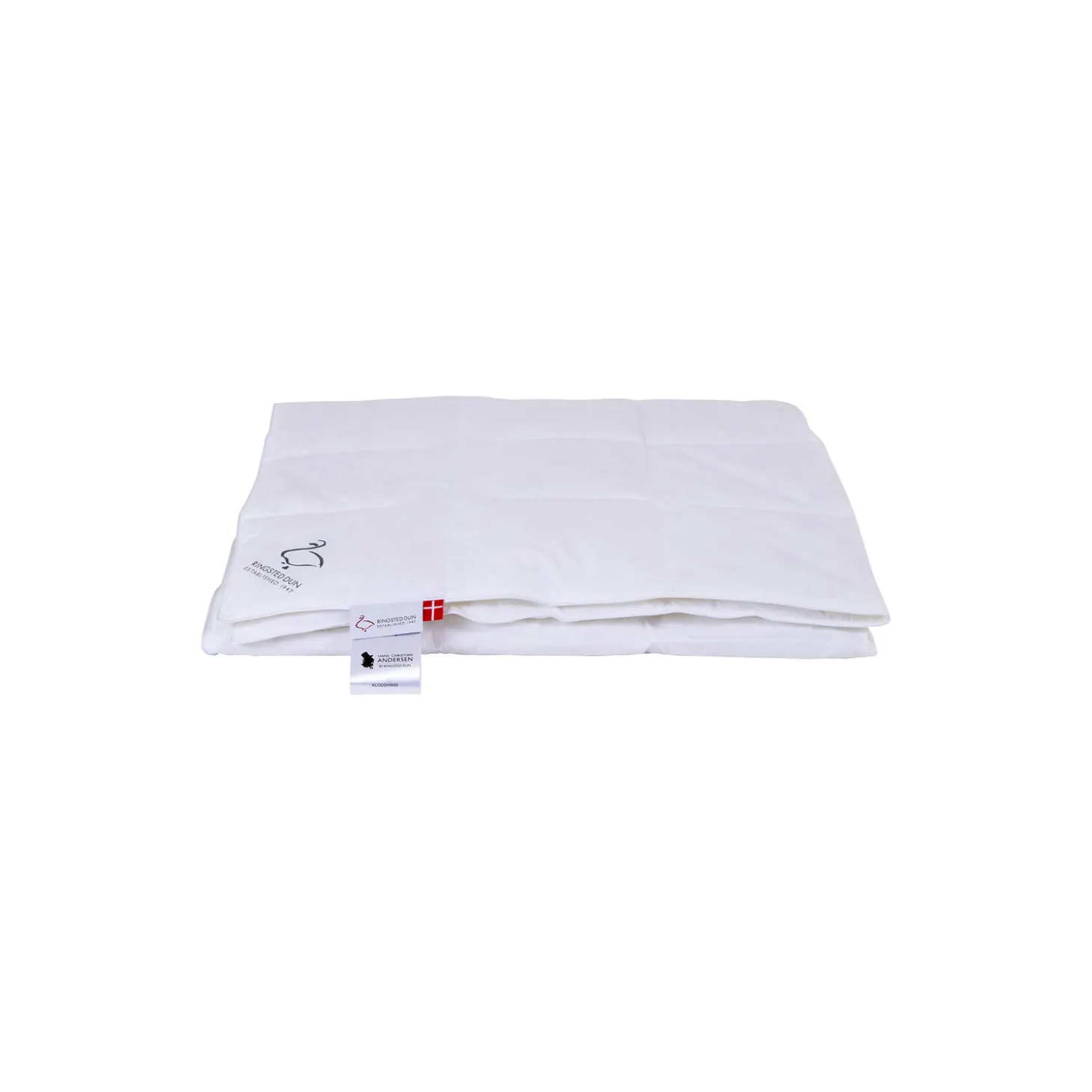 Klodshans ekstra sval sommerdyne med moskusdun og småfjer og vår i 100% bomuldscambric fra Ringsted Dun. Farve: hvid. Mål: 140×200 cm. Fyldmængde: 200 g. Bæreevne over 11.