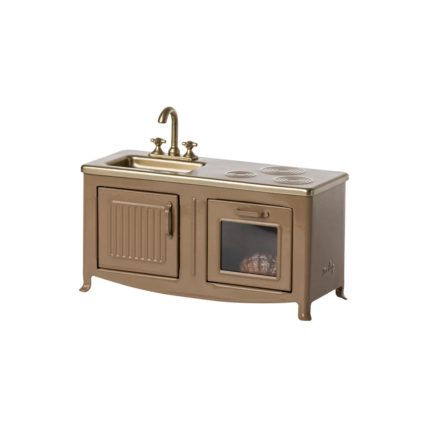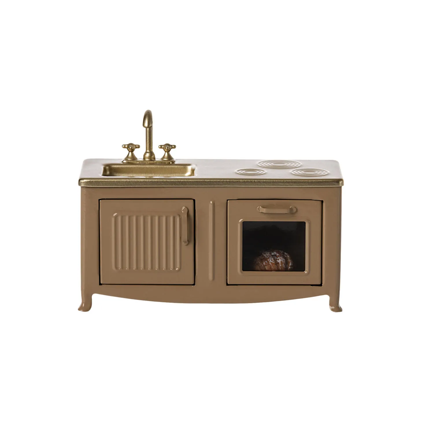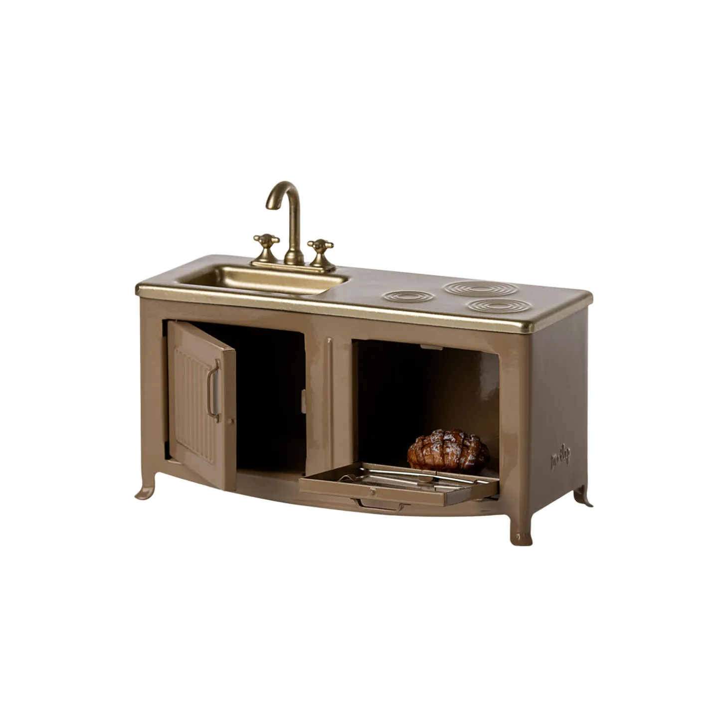 Hjertet i ethvert hjem er køkkenet. Dette metal køkken har en smuk farvetone og har mange fine detaljer såsom skabslåge, vask og en ovn med nybagt tærte. Den passer perfekt i størrelsen til musefamilien.