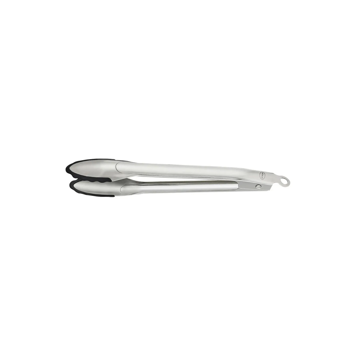 RÖSLE køkkentang med patenteret åbnemekanisme, der gør det muligt at åbne og låse tangen med kun én hånd. Silikonebelægningen forhindrer ridser i kogegrej med belægning eller rustfrit stål. Tåler temperaturer op til 260 °C. Tåler opvaskemaskine. Mål: L: 30 cm.