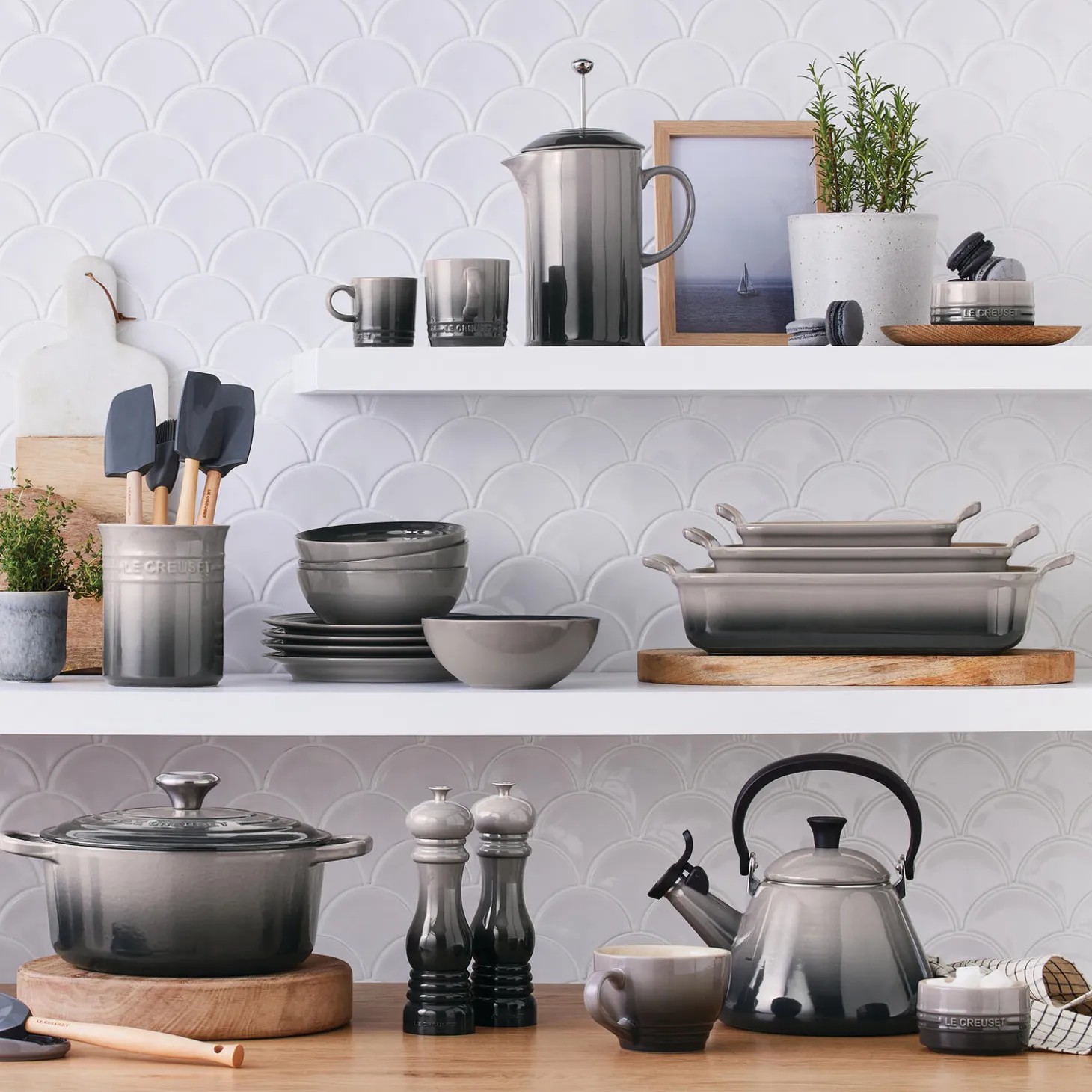 Der er intet, der slår duften af friskbrygget te eller kaffe, og en så vigtig daglig rutine fortjener en elegant kedel. Uanset om du foretrækker et traditionelt eller moderne design, tilfører Le Creusets emaljerede stålkedler både farve og stil til dit køkken. Hver kedel er fremstillet af stål i høj kvalitet og har en slidstærk, farverig emaljeoverflade, der passer perfekt til dit Le Creuset køkkengrej. Alle Le Creusets kedler har en bred bund for effektiv opvarmning og en fløjte, der fortæller dig, når vandet koger. Håndtaget er låst i oprejst position for stabil og sikker hældning. Kedlerne er kompatible med alle typer kogeplader, inklusive induktion og støbejernskomfur. Dækket af en 5 års garanti.