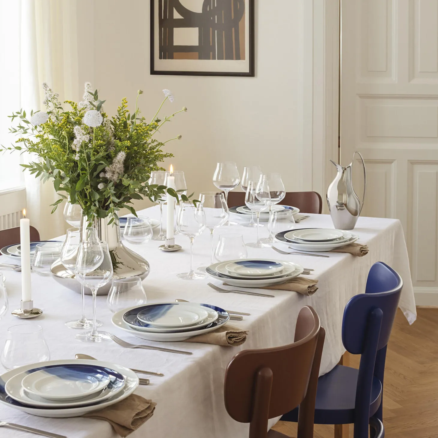 Denne middagstallerken er dekoreret med elegante penselstrøg i graduerede, blå nuancer, som giver porcelænet et smukt og tidløst design. Penselstrøgene afspejler Henning Koppels passion for at udsmykke sine tegninger og designs med håndmalede, blå motiver. Denne detalje giver et usædvanligt unikt udtryk og gør det muligt at skabe en original og kunstnerisk borddækning, når man stabler kollektionens tallerkener i forskellige størrelser.
