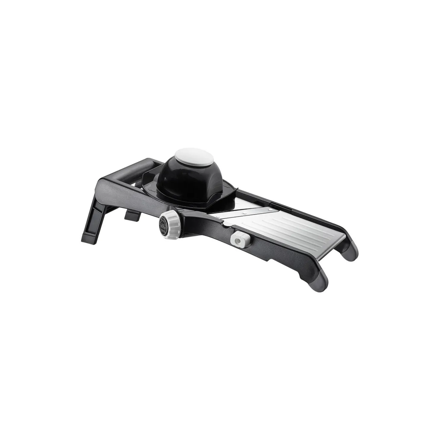Grøntsags slicer fra Gefu, kan justeres til at lave julienne strimler, glatte skiver og bølgede skiver ved hjælp af håndtaget på siden. Skæretykkelserne kan justeres fra 1-9 mm med skriverne og 4,5-9 mm med julienne strimlerne. Grøntsags sliceren står stabilt på køkkenbordet ved hjælp af de skridsikre fødder, som også kan holdes ned efter brug, så den fylder mindre. Den har aftageligt knivindsats for nem rengøring og kan også tåle af komme i opvaskemaskinen, da grøntsagssliceren er lavet af rustfrit stål og plast i høj kvalitet.