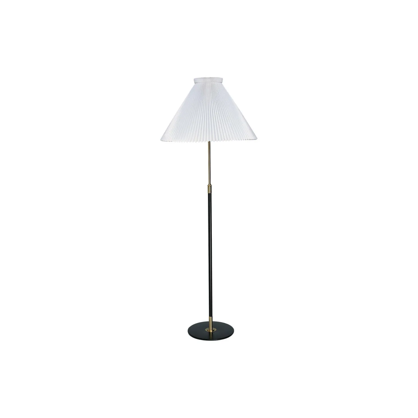 LE KLINT 351 gulvlampe med 1/38 skærm i håndfoldet plast og stativ i stål og messing fra LE KLINT. Farve: messing/sort/hvid. H: 121-170 x Ø 55 cm. Lyskilde: maks. 60W E27. Design: Aage Petersen.