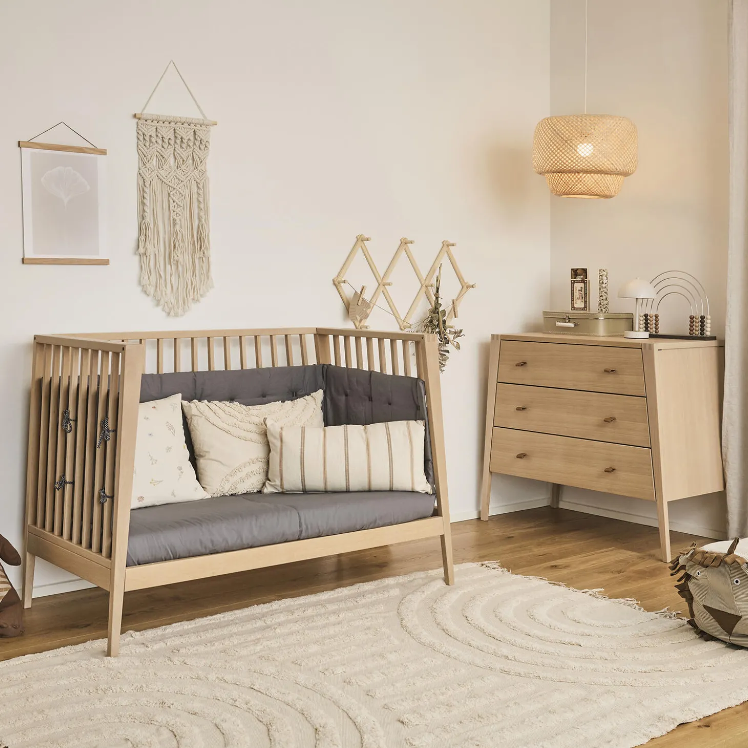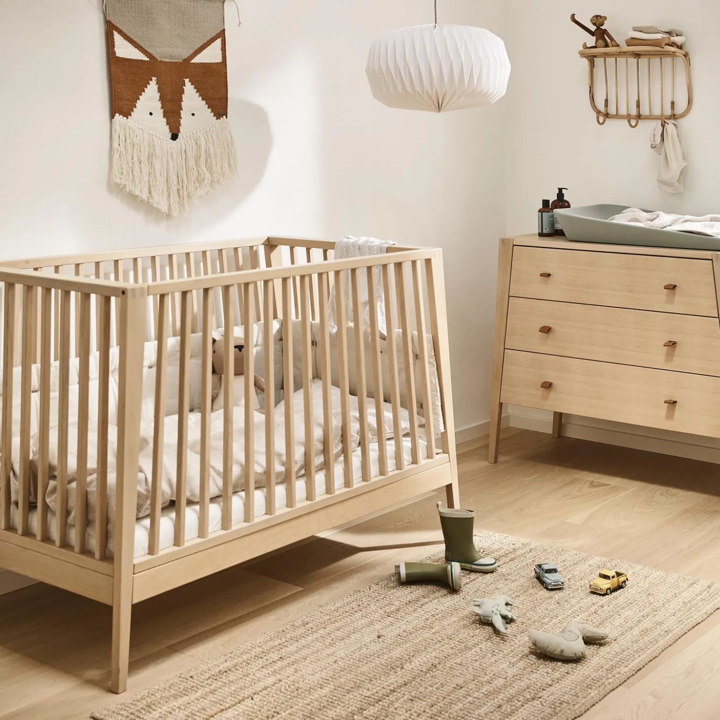 Dit barn har brug for masser af tryghed, særligt ved sengetid. Med Leander Linea™ babysengen får du et stilfuldt, nordisk designmøbel, der med smukke håndværksdetaljer og fokus på kvalitet giver dit barn en tryg base, når det er tid til at gå til ro.Sengen har fire fleksible indstillinger, så du kan bruge den i mange år. Start med at bruge tremmesengen med løftet bund og høje gavle. Det vil skåne din ryg, når du skal putte din baby. Når dit barn begynder at kunne rejse sig, anbefaler vi, at du sænker bunden. Når der ikke længere er brug for tremmerne, kan du fjerne sengens ene side, så dit barn selv kan kravle ind og ud af sengen. Når sengen er blevet for lille til at sove i, kan du lave den til en hyggelig, lille sofa. Babysengen med åben side må ikke benyttes som sideseng op ad forældresengen. Sengen er ikke godkendt som sideseng.Skab en hyggelig stemning på børneværelset og omkring sengen med smukke, farvekoordinerede tekstiler i Leander Linea™ serien. Her finder du sengerand, lagner og sengetøj, som du kan kombinere på kryds og tværs alt efter din personlige stil og smag.Madras, der sikrer optimal liggekomfort og ventilation fås separat.
