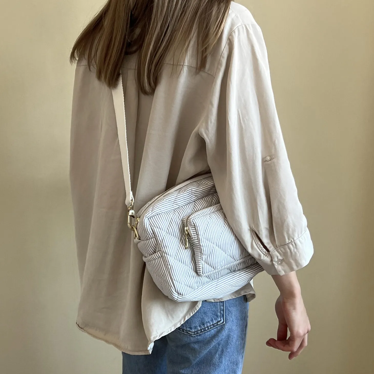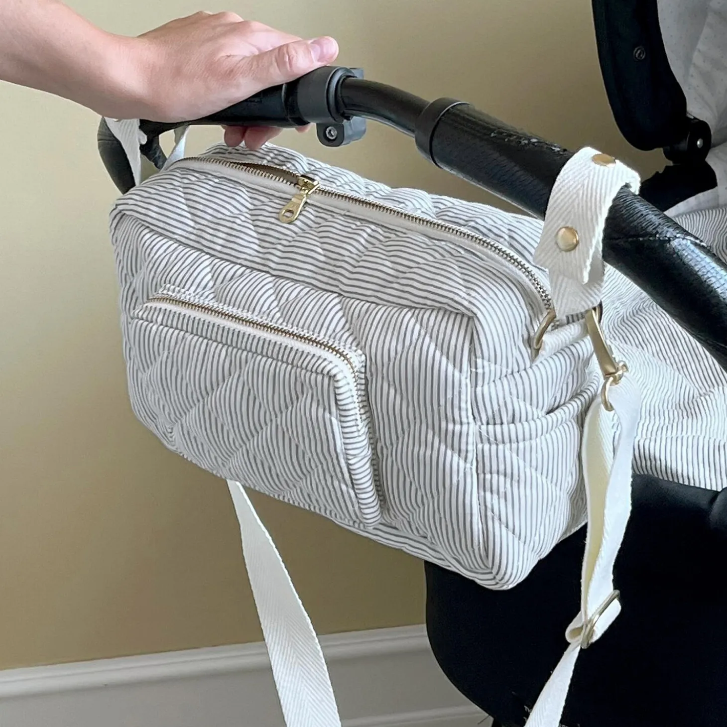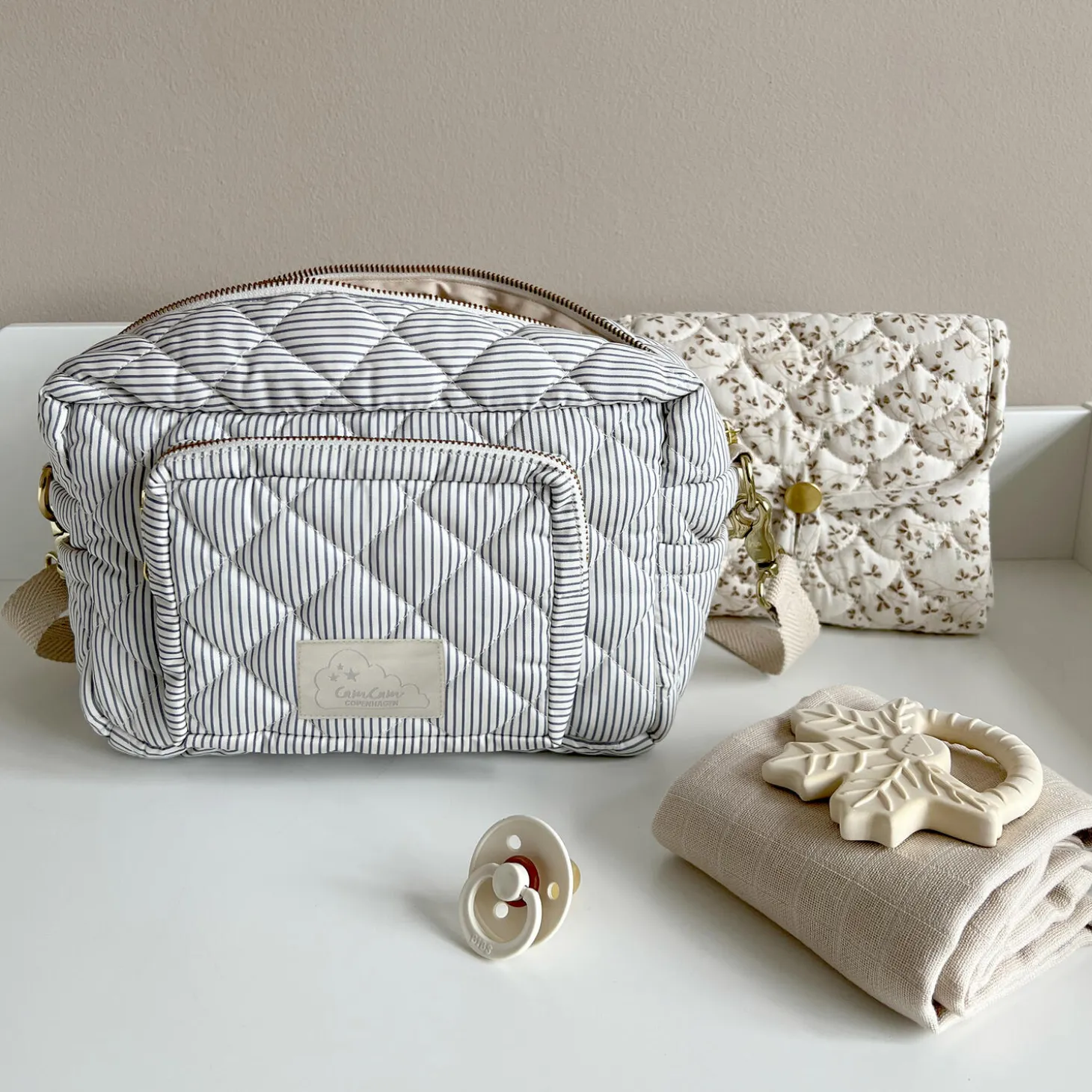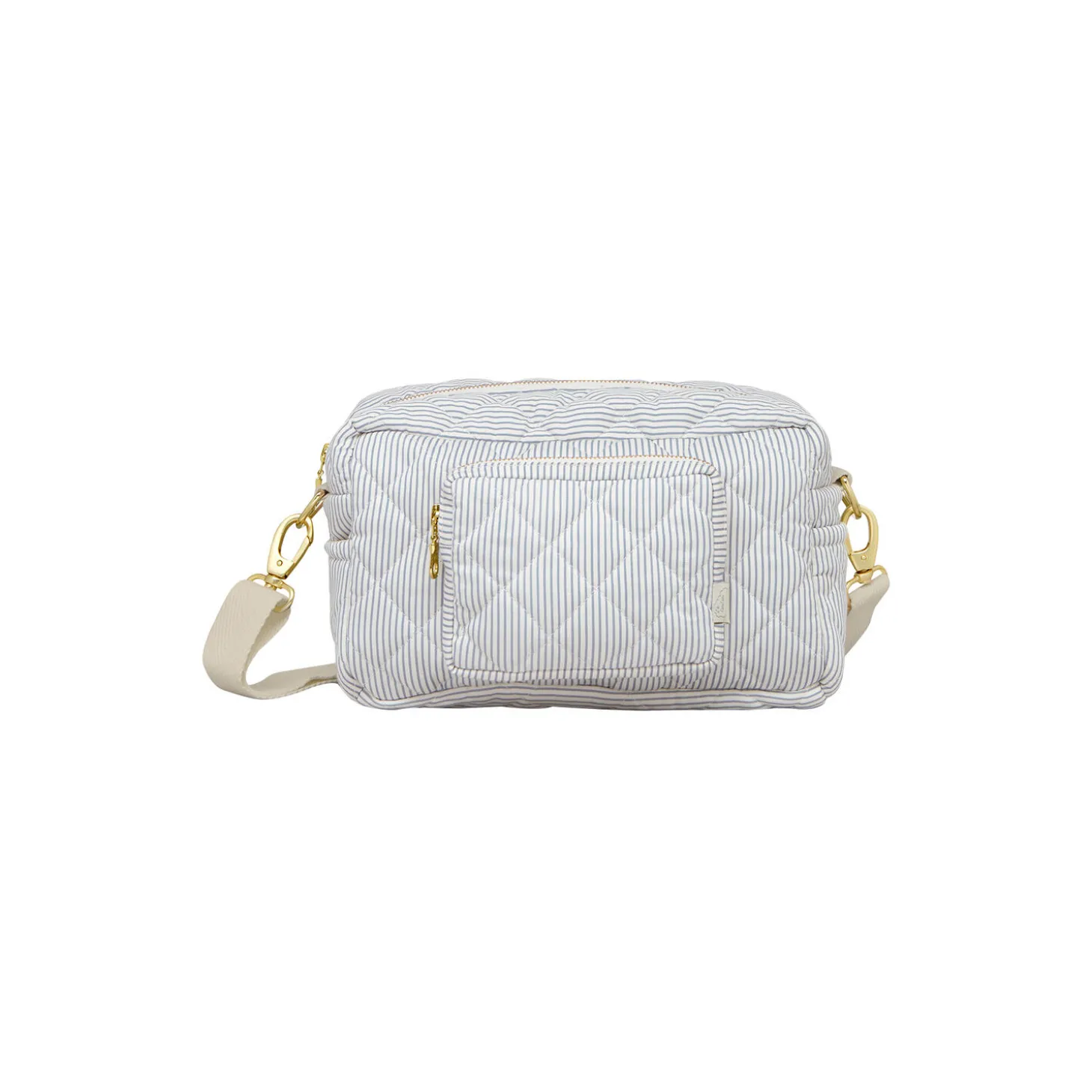 Funktionel og stilfuld quiltet pusletaske, der også fungerer som en crossbody taske.Fastgør den lille pusletaske med de særlige stropper til din klapvogn, og hav dine daglige ting lige ved hånden. Pusletasken holder styr på alt og er overraskende rummelig.Tasken er coated både indeni og udenpå, hvilket gør den holdbar, samt vand- og smudsafvisende. Den har messing YKK lynlåse, på ydersiden er der en praktisk lomme med lynlås, indeni tasken er der en isoleret lomme til flasken og praktiske elastiklommer til organisering.