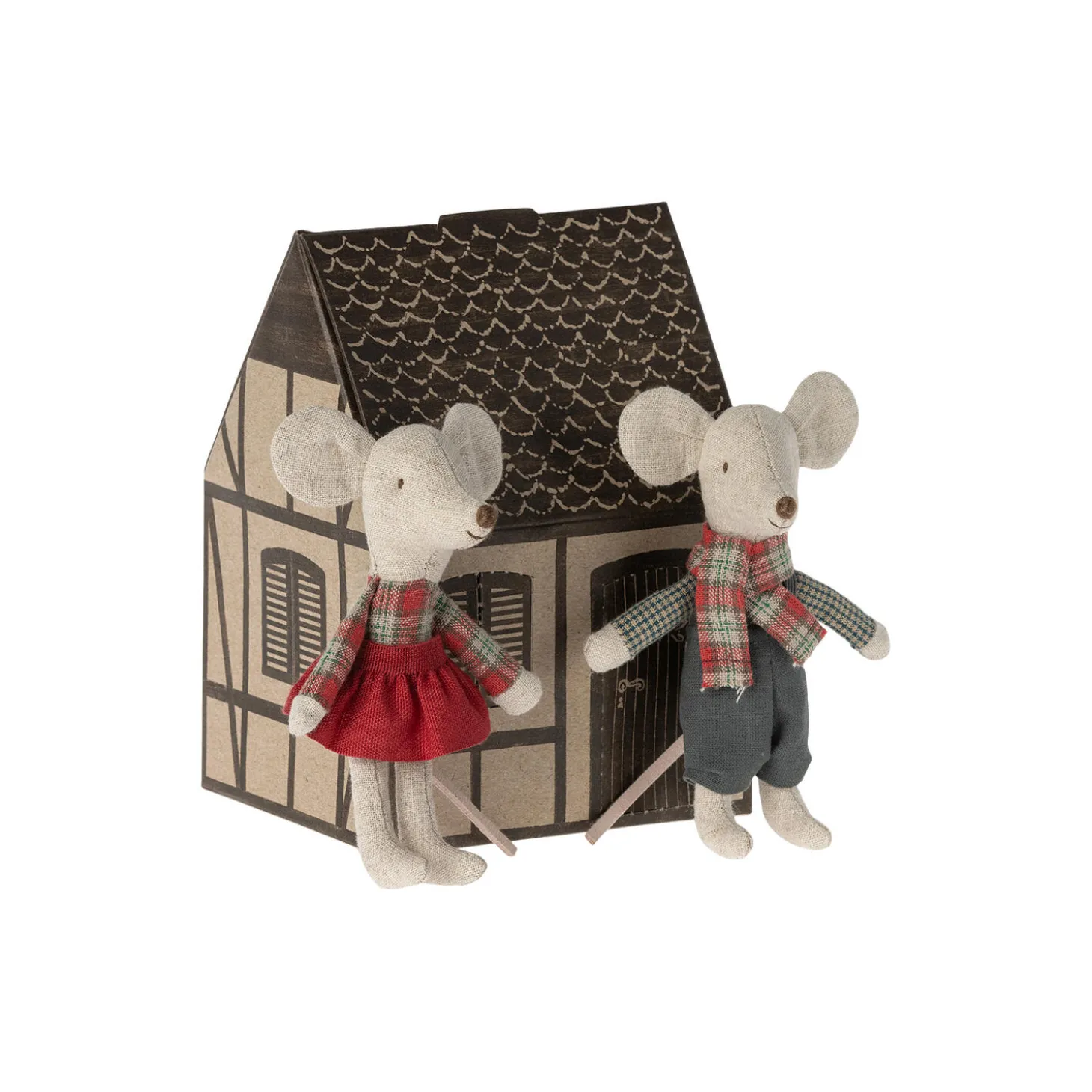 Disse tvillingemus er klar til en masse sjov i den kolde vintertid. De kommer i et lille hyggeligt papirhus, som kan indgå som en del af legen. Når de skal ud på pisterne med de ældre mus, passer træslæden perfekt til disse tvillinger.