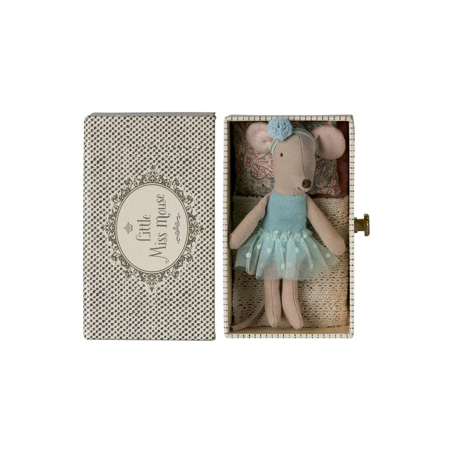 Det er vigtigt at have et sted at hvile sig efter en danselektion. Denne lille mus kommer i en smuk kasse, der kan bruges som en seng. Stoffet kan variere.