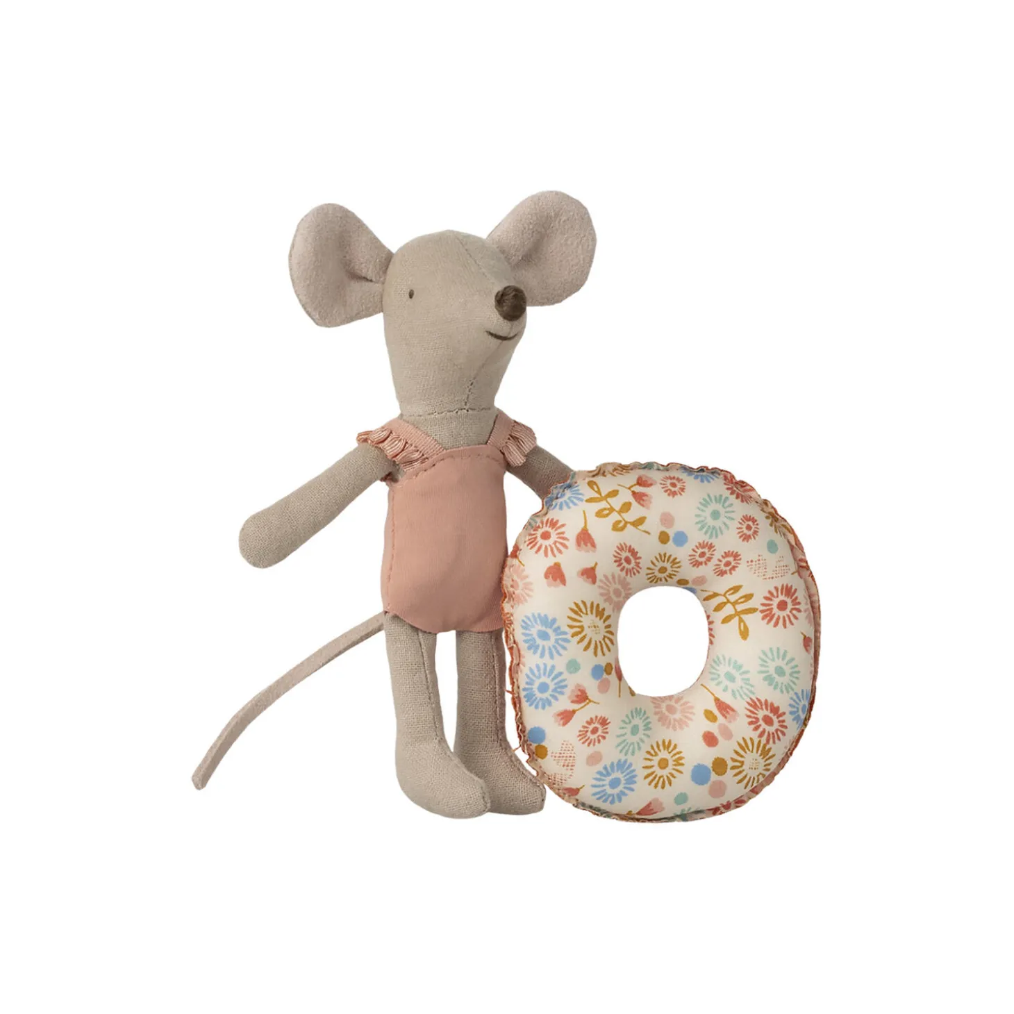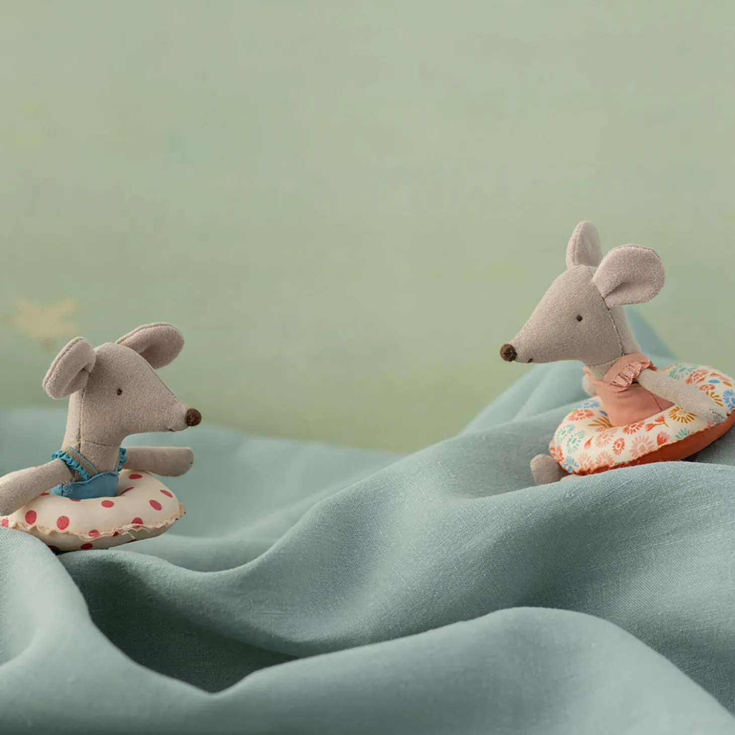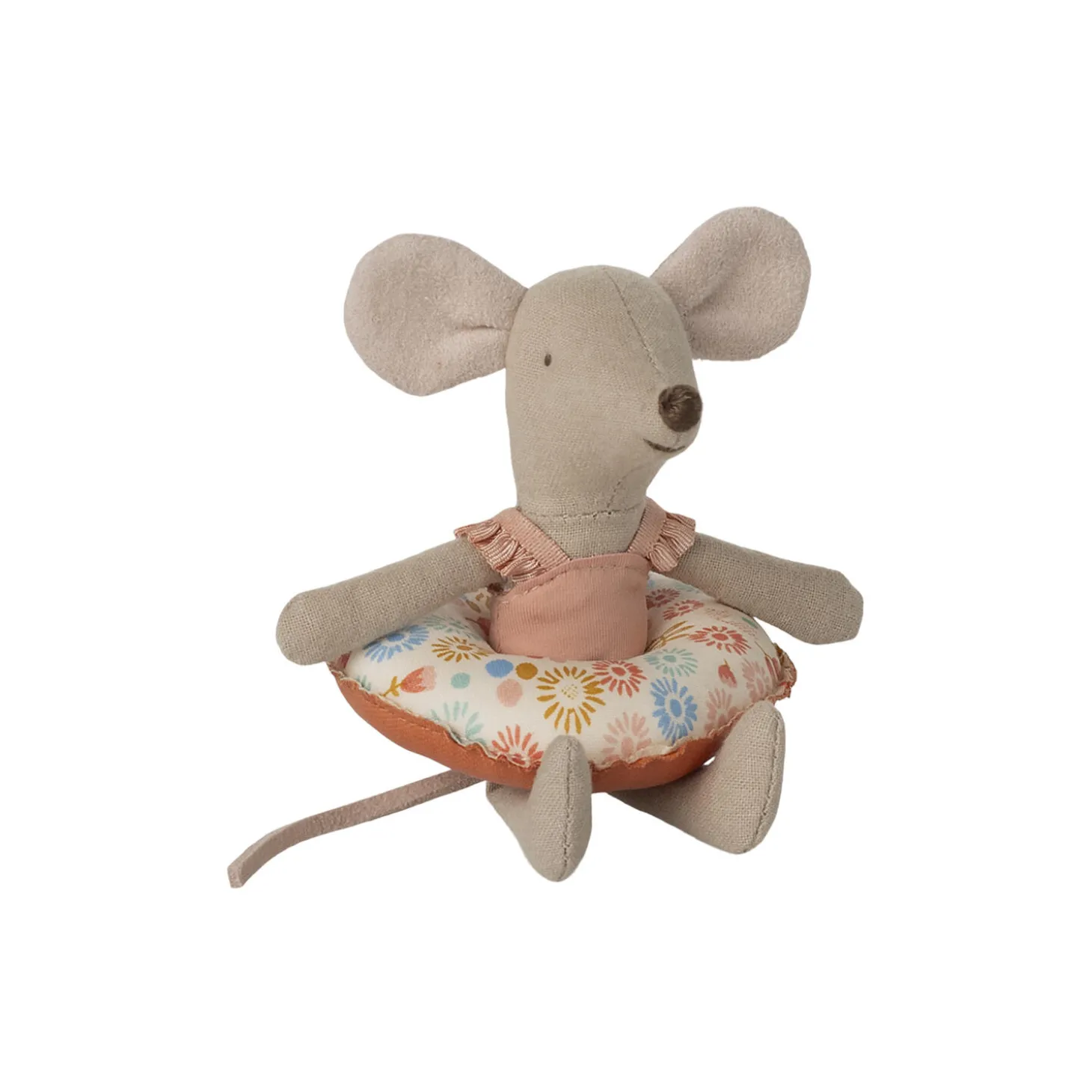 Dette sommersæt består af en lillesøster mus iført en rosafarvet badedragt med hendes blomsterprintede badering omkring maven. Hun er nu klar til en sikker svømmetur i havet.