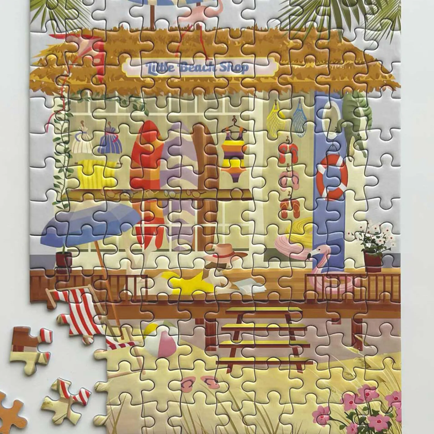 Den lille strandbutik finder du alt, hvad du behøver til en perfekt dag ved vandet – badetøj, solbriller og sjovt strandlegetøj. Hvad kunne du tænke dig? Vores lille puslespil med 150 brikker tager mellem 15 og 60 minutter at samle. Det giver dig en stund med ro og nærvær, når du har brug for det. Puslespillet indeholder små brikker og bør ikke komme i nærheden af børn under tre år.Puslespillet måler 15×21 cm. Spillet er FSC certificeret og lavet af C1S og Greyboard papir.