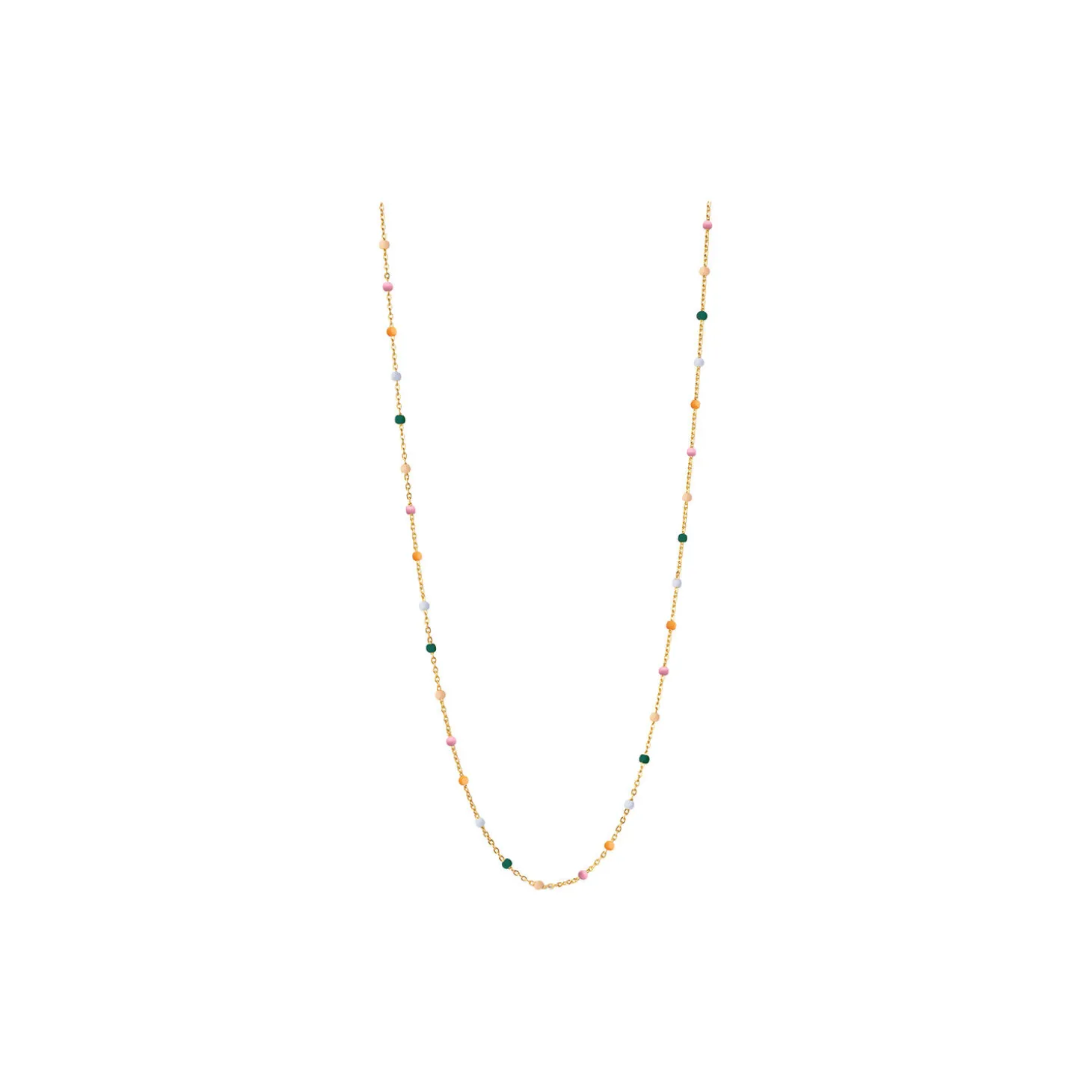 Lola halskæde er en fin kæde med små emaljer. Halskæden giver en fin detalje og kan perfekt kombineres med andre halskæder. Findes i flere farver. Obs: Vær opmærksom på IKKE at bære vores Lola styles i bad, når du sover og for tæt på parfumer og cremer, da emaljen kan ændre farve og struktur.