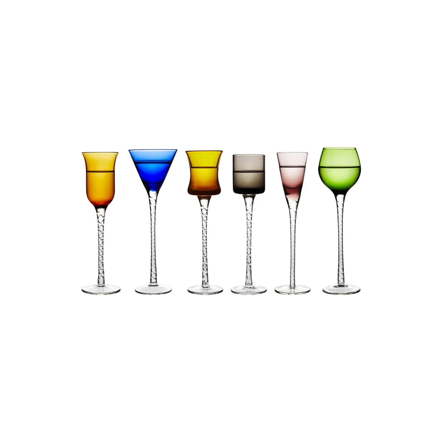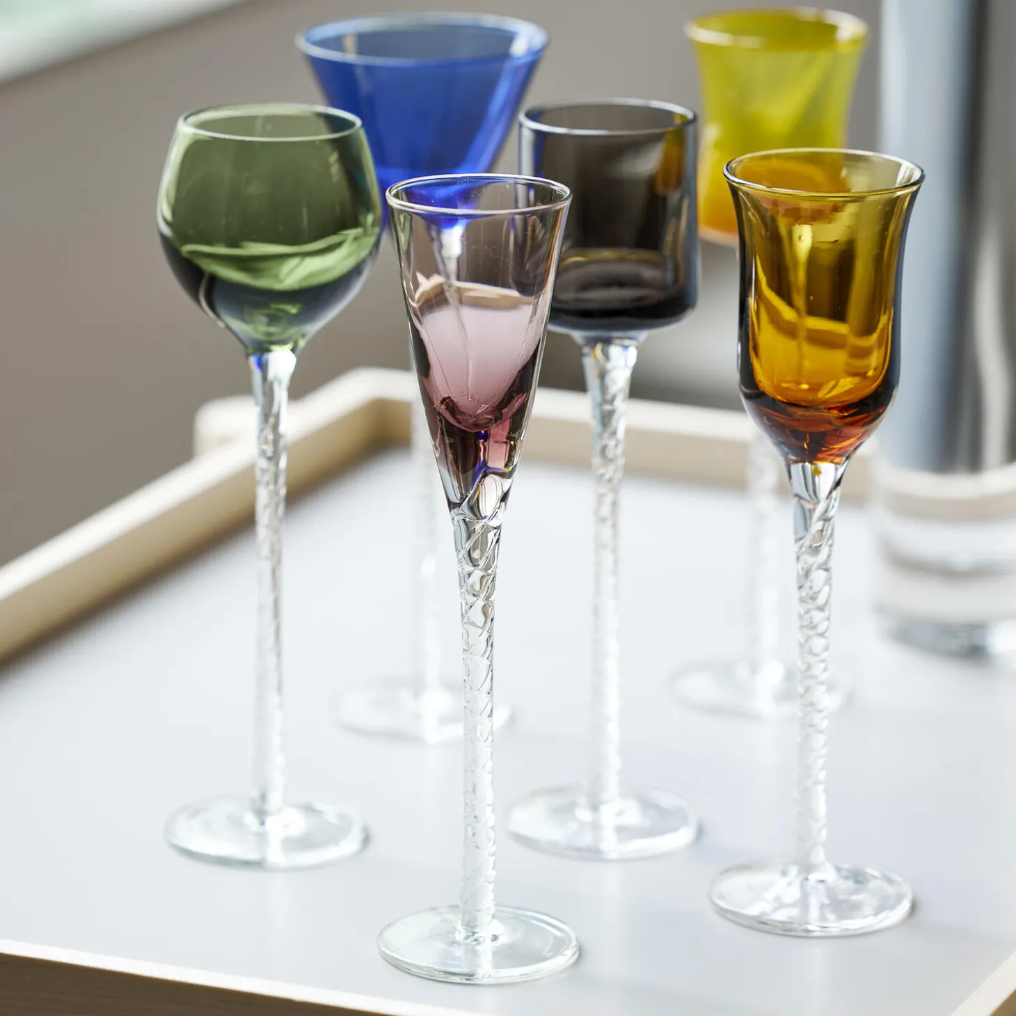 6 forskellige gennemfarvede, mundblæste snapseglas med snoet stilk bidrager til en god stemning ved bordet, og det er nemt at finde sit eget glas. Snapseglassene har forskellige udformninger i farverne lilla, blå, smoke, amber, grøn og gul og indeholder fra 2,5 op til 5 cl.