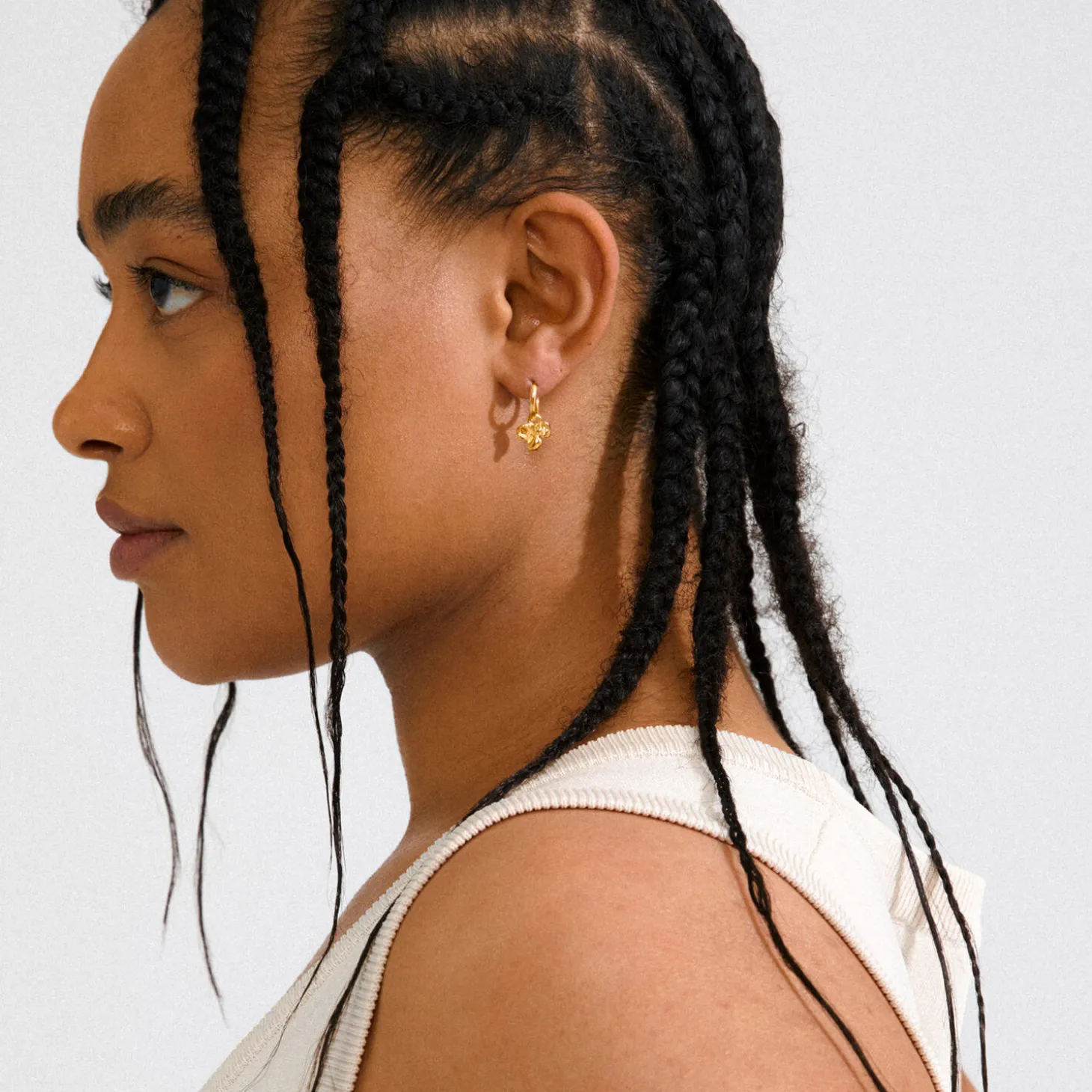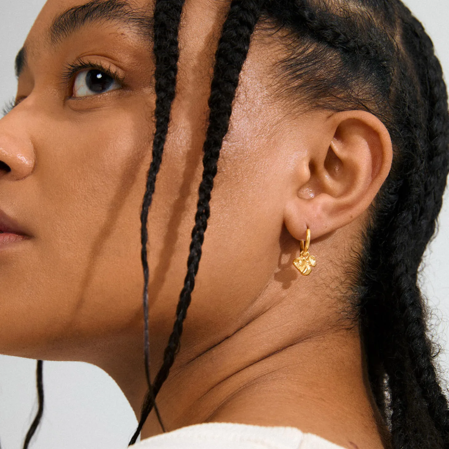 Effortless elegance! Guldbelagte hoops med abstrakte blomster-vedhæng – dine nye faves for et effortless look. Style med de organiske vedhæng for en boho lux vibes, eller tag blomsterne af og gå clean og minimalistisk med en klassiske huggie hoop – det er dit mood, der bestemmer. Perfekte til efterårets oversized blazere og chunky loafers for et quiet luxury look, med et cute twist. Easy-to-use kliklåse gør øreringene nemme og praktiske i brug. Og guess what? – de er fremstillet af 99% genanvendt materiale. Det er fashion med omtanke.