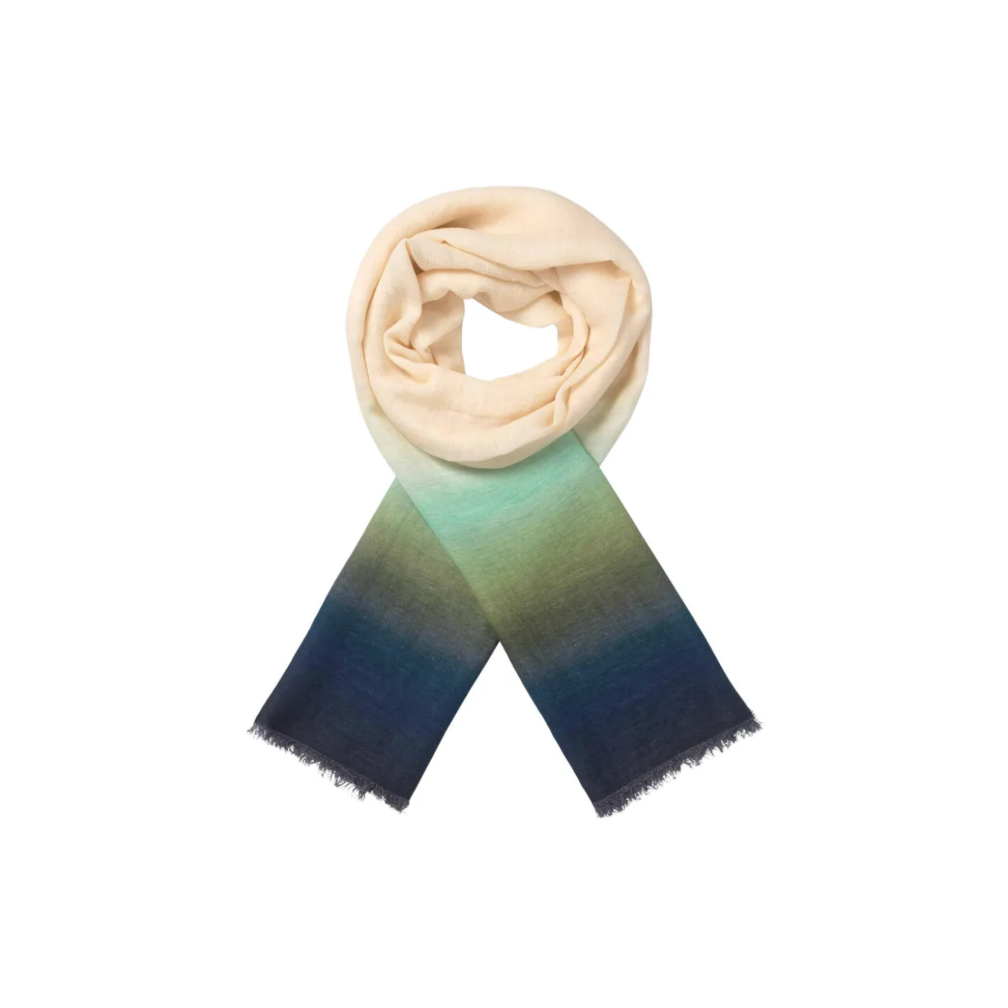 Elegant tørklæde i råhvid med håndmalet print i grønne og blå nuancer i enderne. Brug tørklædet som et stilfuldt pift, og nyd følelsen af det bløde mix af modal, bomuld og hør mod halsen.