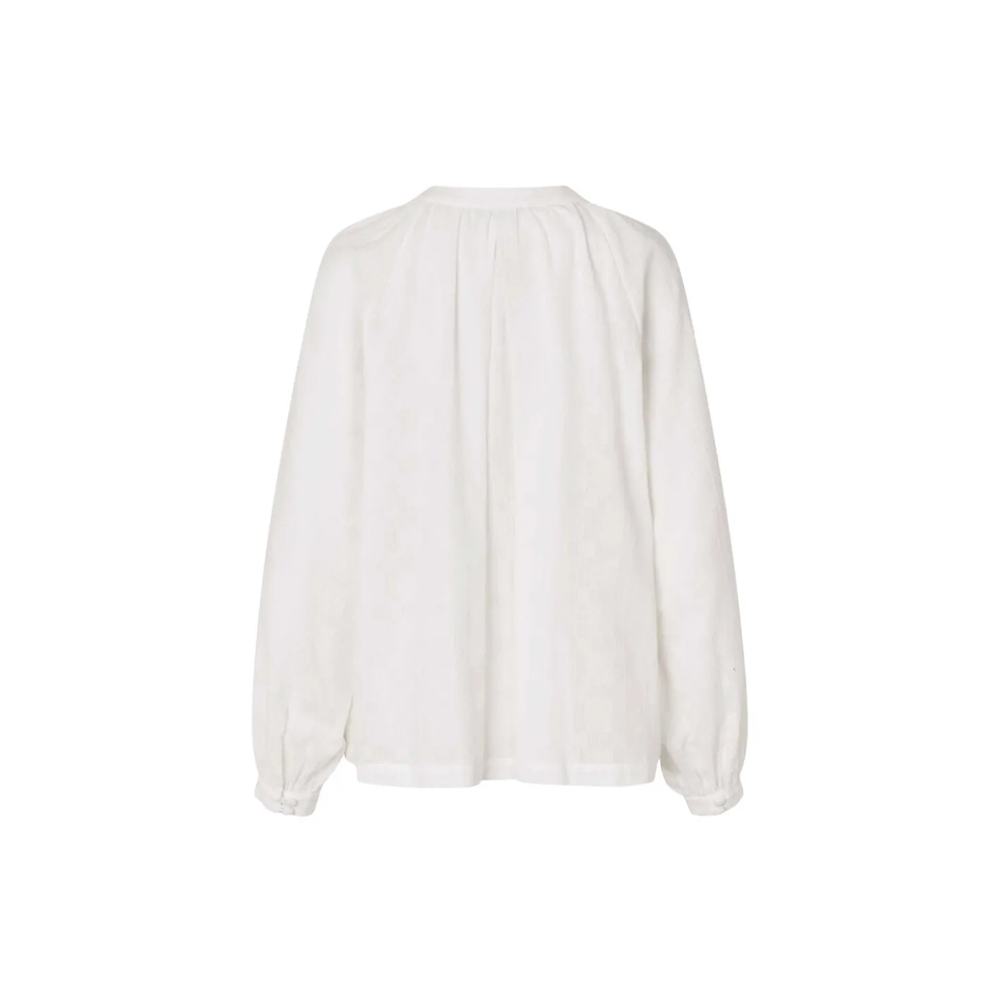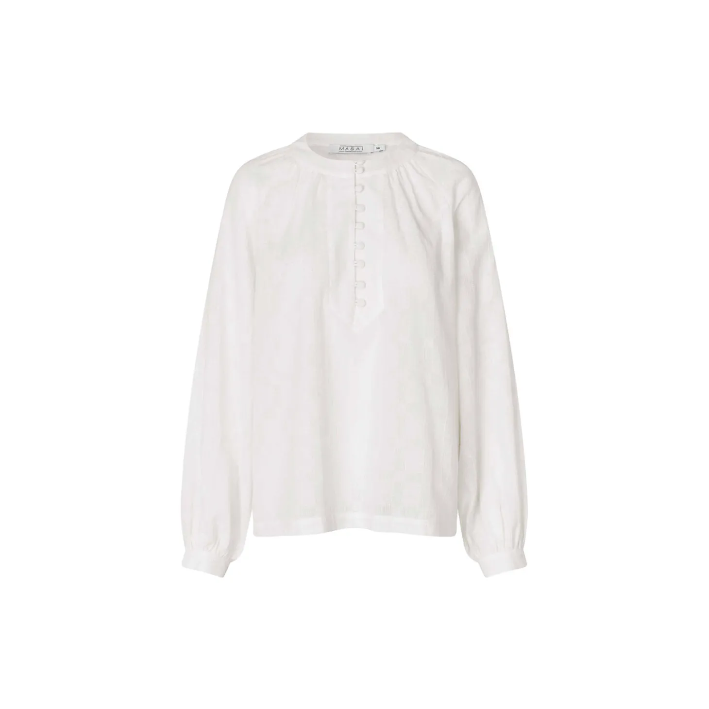 Feminine hvid top i blød bomuld med vævede tern, der tilfører en skøn tekstur til dit look. Den er designet med rund hals, stofbetrukne knapper og et klassisk snit for ultimativ komfort.