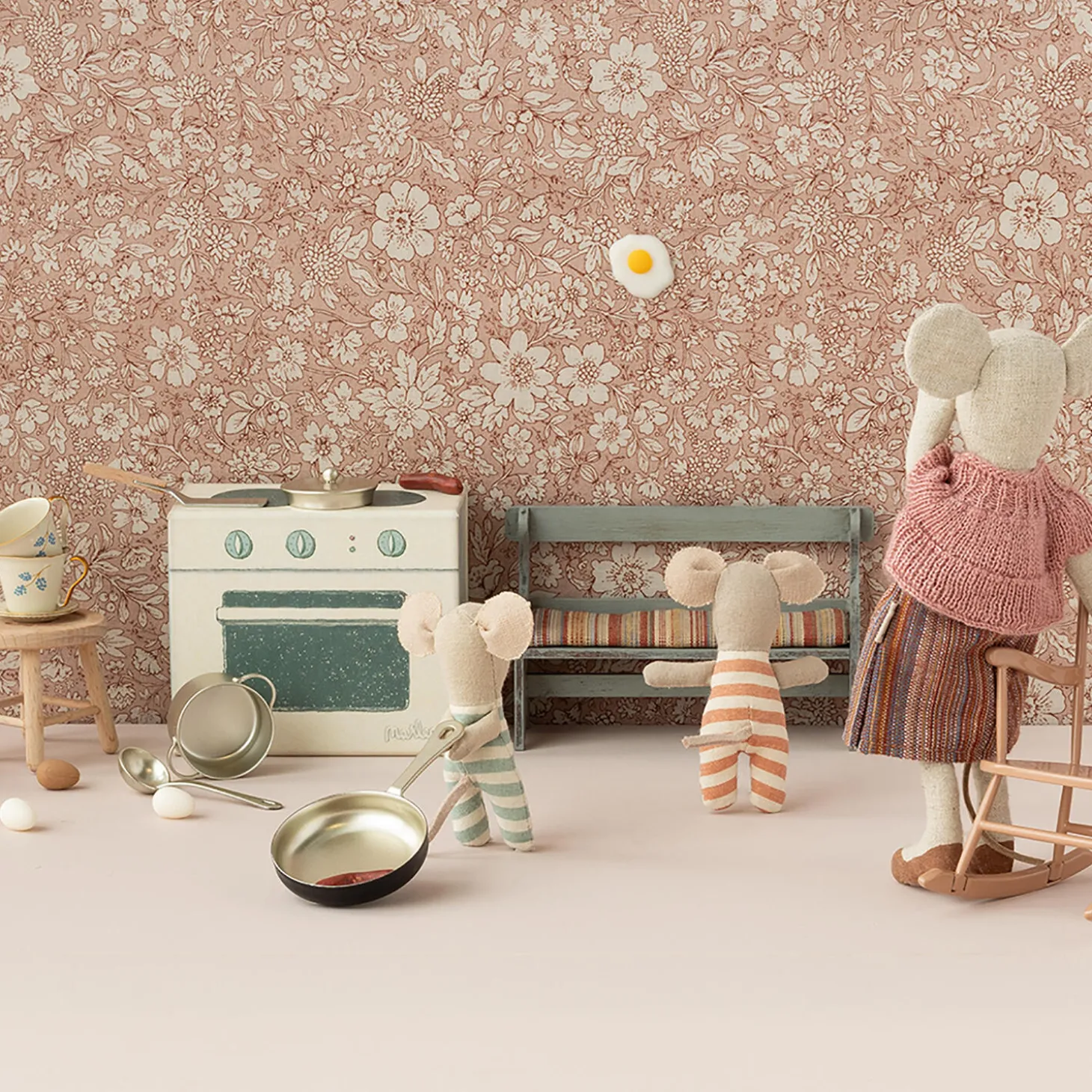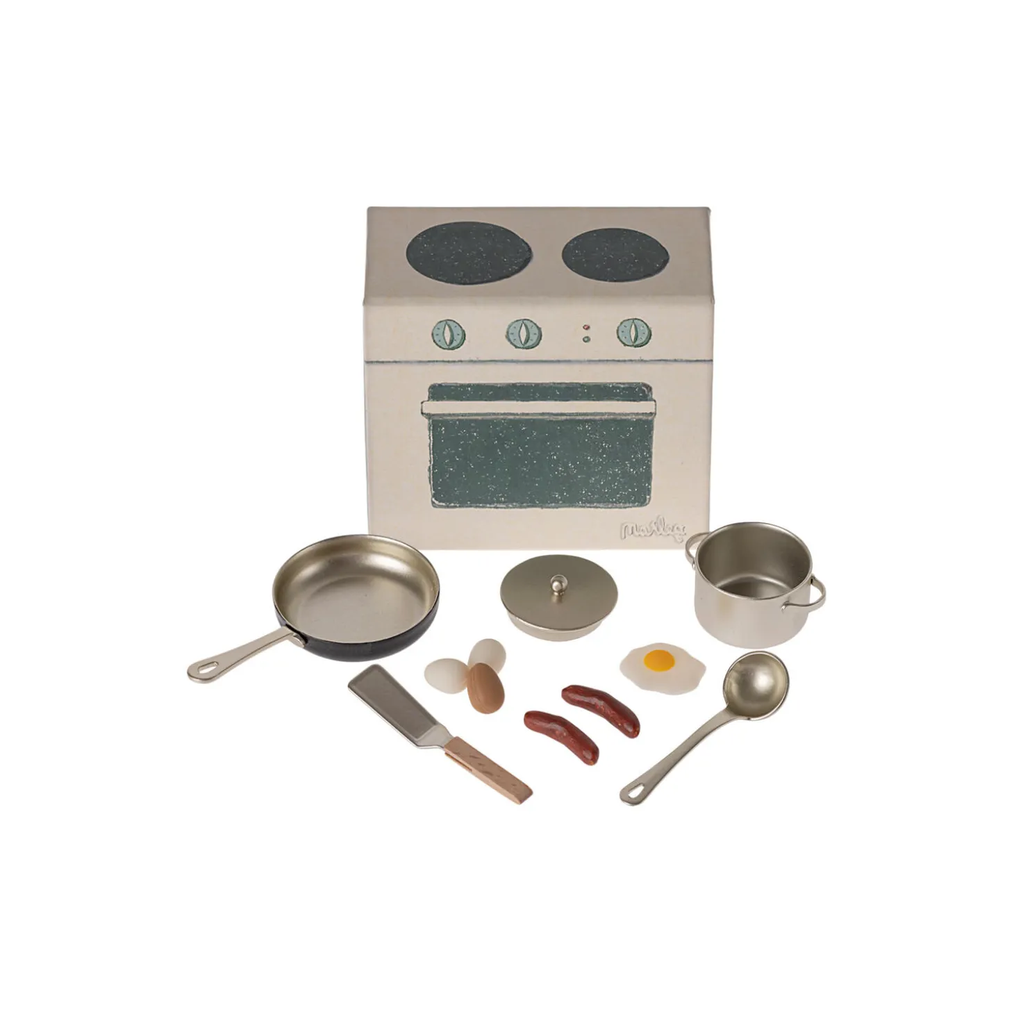 Et lille madlavningsæt til der passer til alle mus. Sættet inkluderer køkken redskaber, æg og pølser til at lave en god morgenmad. Pakken kommer i kraftigt pap, der er dekoreret som et komfur og kan bruges som en del af legen.