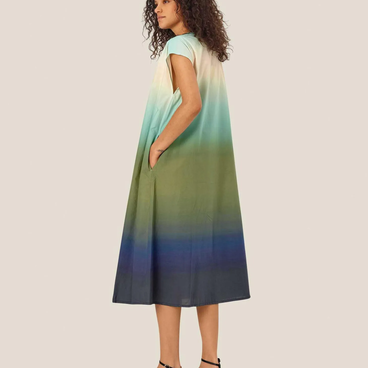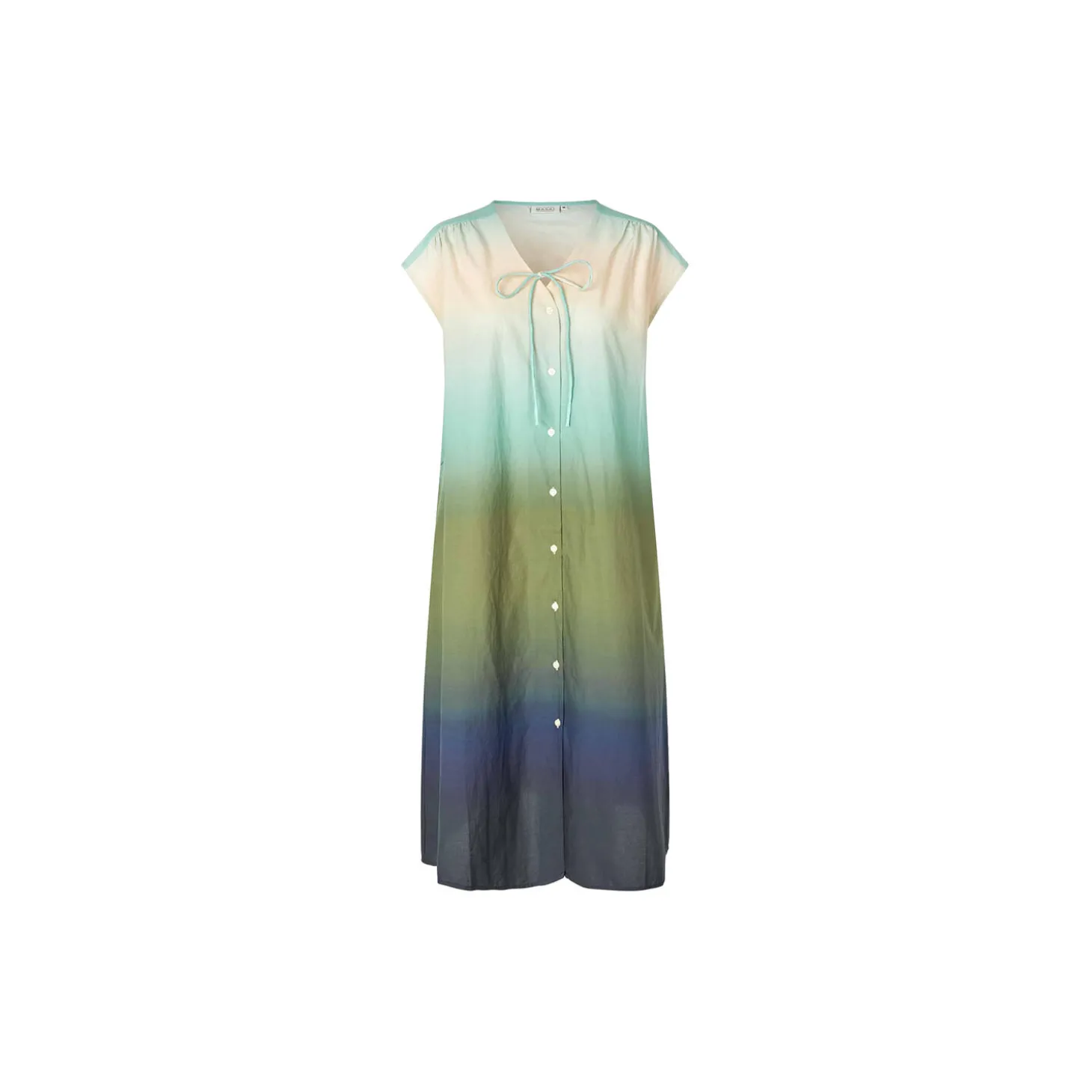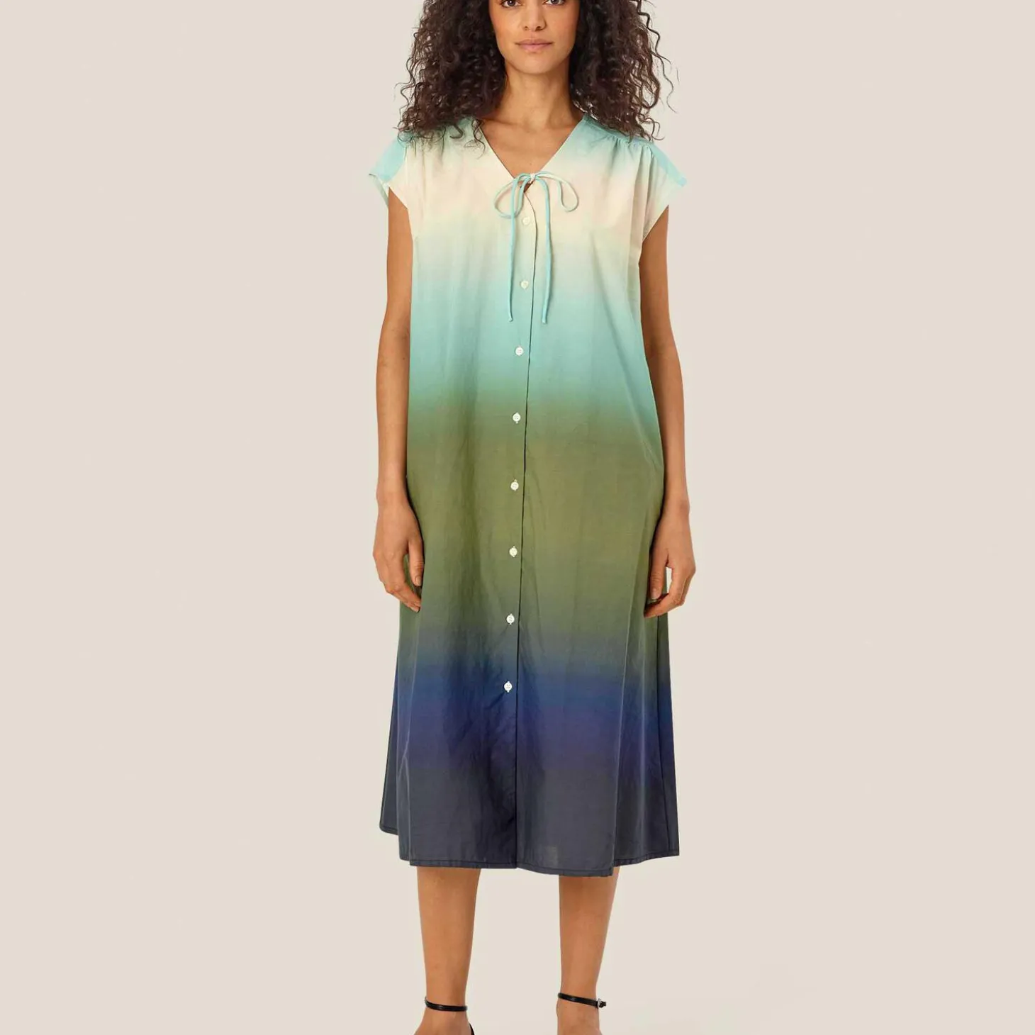 Skab et afslappet bohemelook med denne florlette bomuldskjole, der graduerer i farverne. Kjolen har et løst A-formet snit og feminine detaljer: Bindebånd, læg på skuldrene og skønne stiklommer.