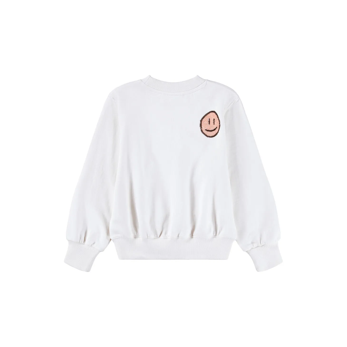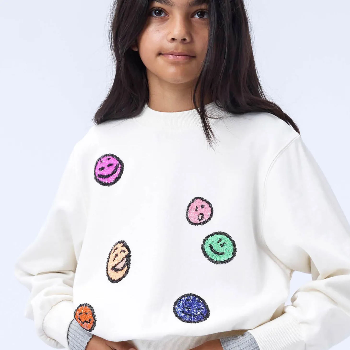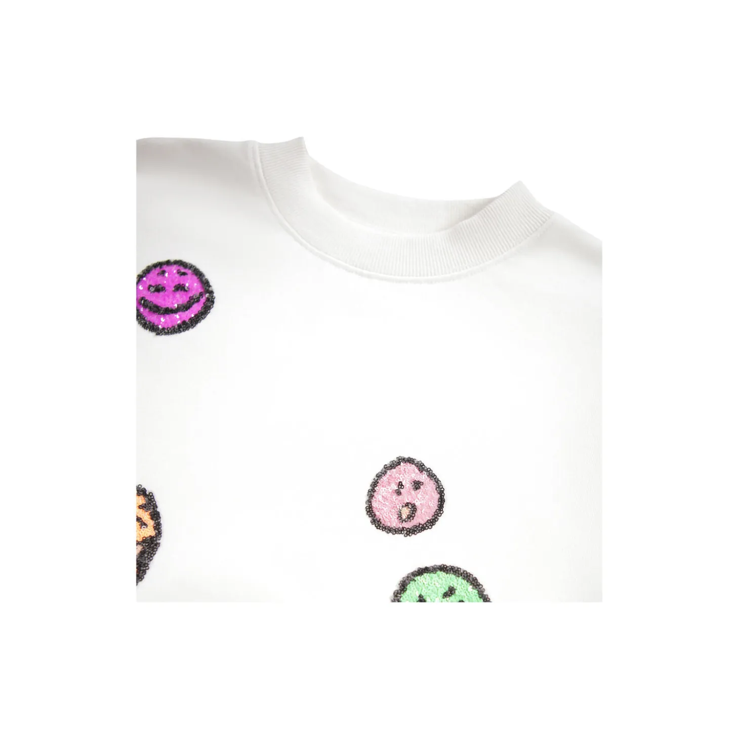 Sweatshirt er lavet af økologisk bomuld med rund hals og ribkanter. Sweatshirten har en oversize pasform og er broderet med multifarvede paillet-ansigter på fronten.