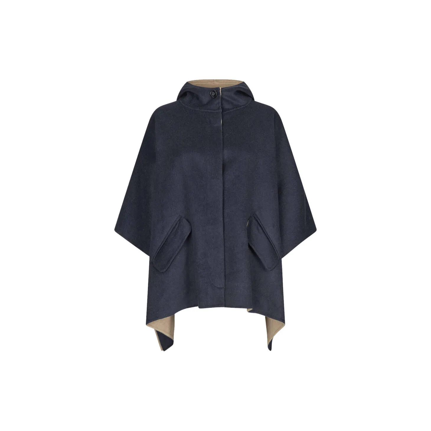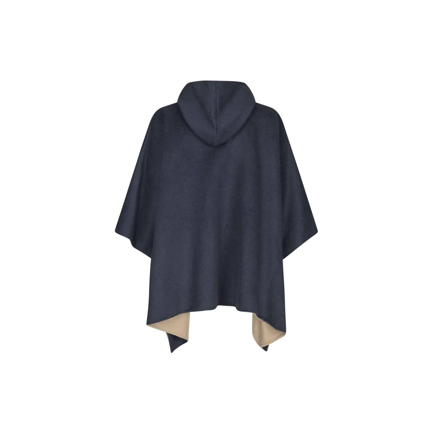 Stilren kappe i mørkeblå med karamelfarvet inderside, der titter frem. Kappen har et oversize snit og byder på en blød kvalitet med 50 % uld, høj hals, blød hætte og lommer foran.