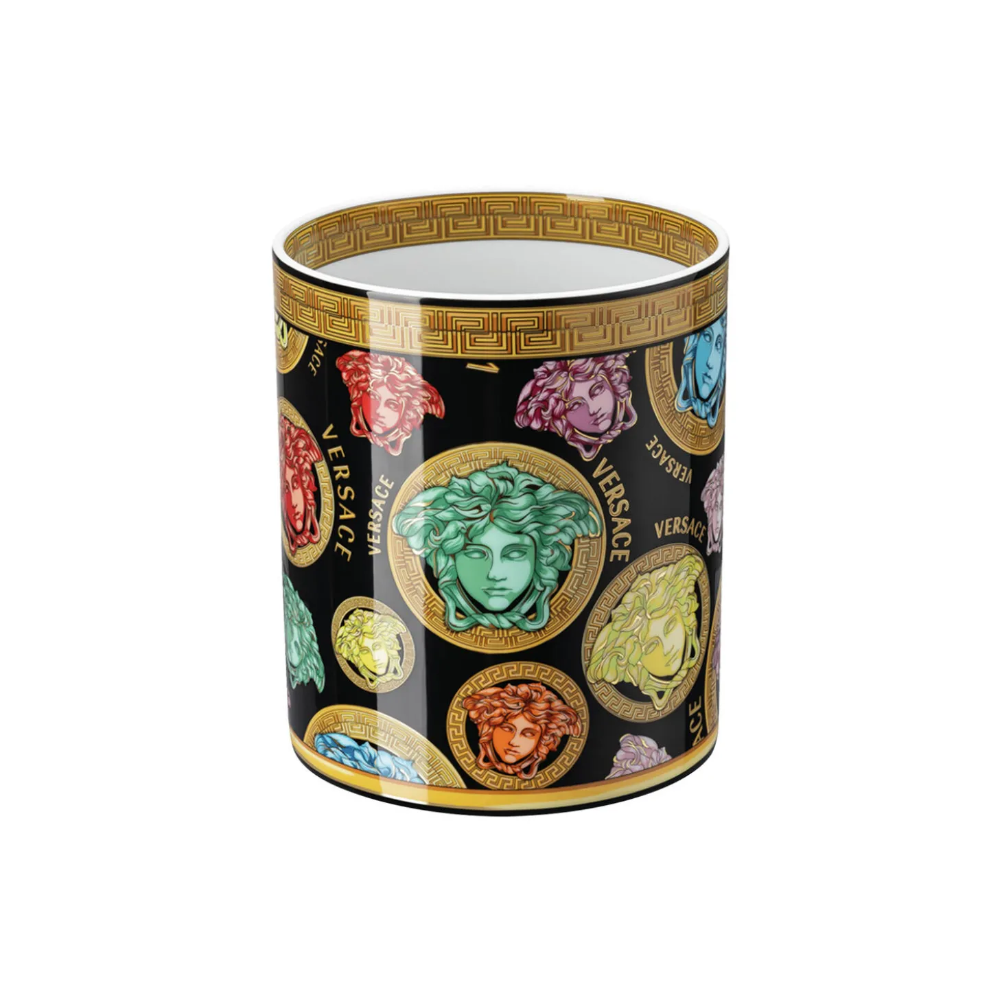 A multicolored porcelain Medusa Amplified vase with a Greca border motif.