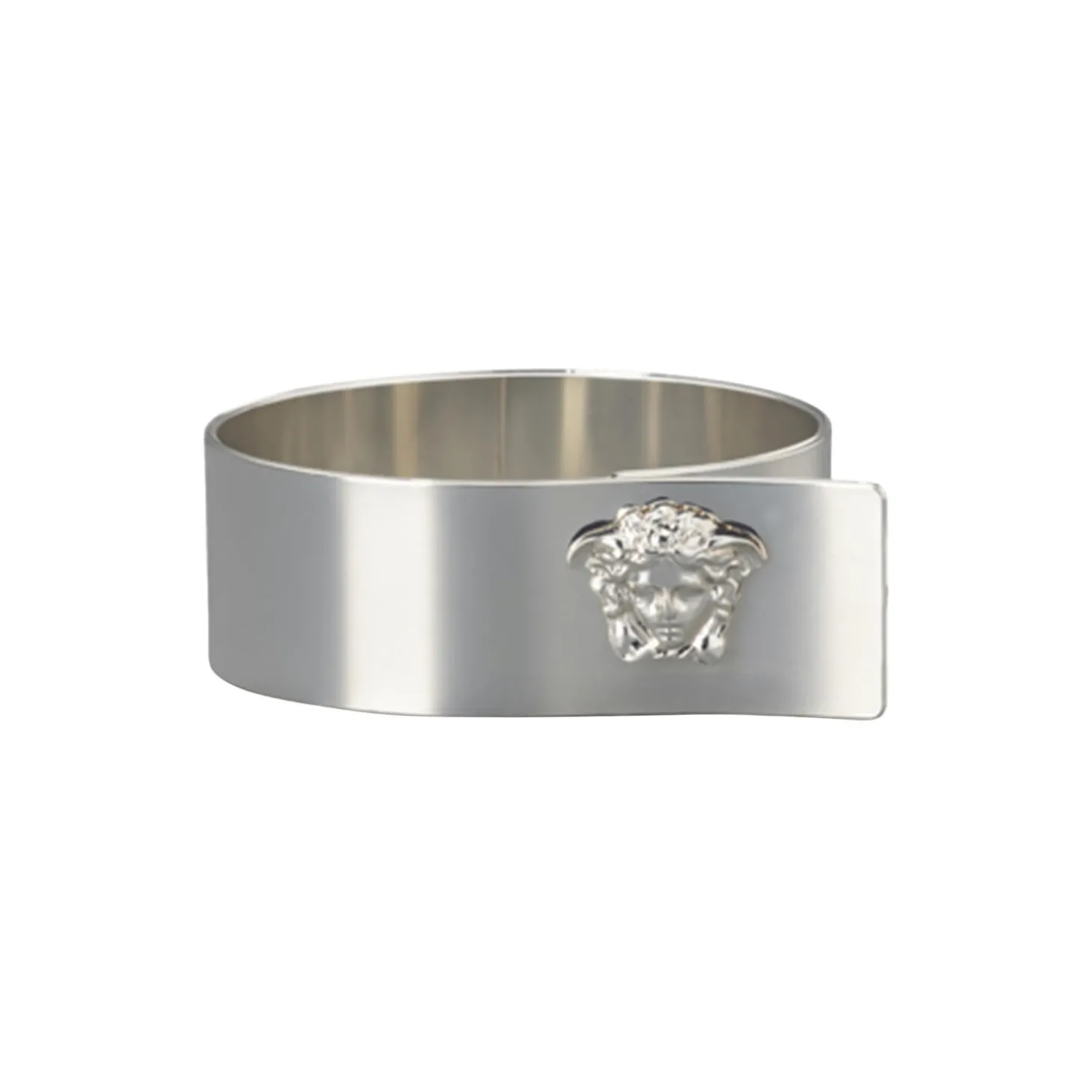 This metal napkin ring in a polished finish features a tonal Medusa stud at the front.
