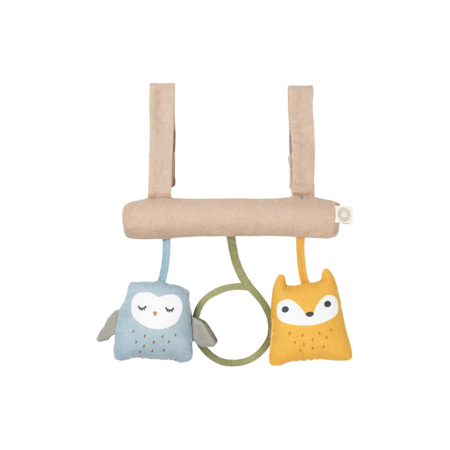 Memo activity toy is designed with beautiful colours to attract baby’s attention. It has 3 cute toys to entertain your little one – an owl with a rattle, a fox with a squeak inside and a mirror. Babies will enjoy reaching out to play with the toys and this helps develop motor, hand-eye coordination and visual skills. Memo is made of organic cotton. Hang it easily on the baby gym, pram or car seat.