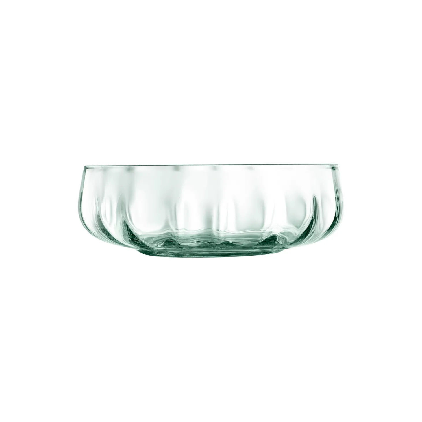 En mindre lav skål med en diskret riflet tekstur. Mundblæst af 100 % genbrugsglas, glasset har en subtil grøn nuance med et par luftbobler til stede, karakteristisk for den håndlavede proces. Til servering af salat eller fremvisning af frugt.