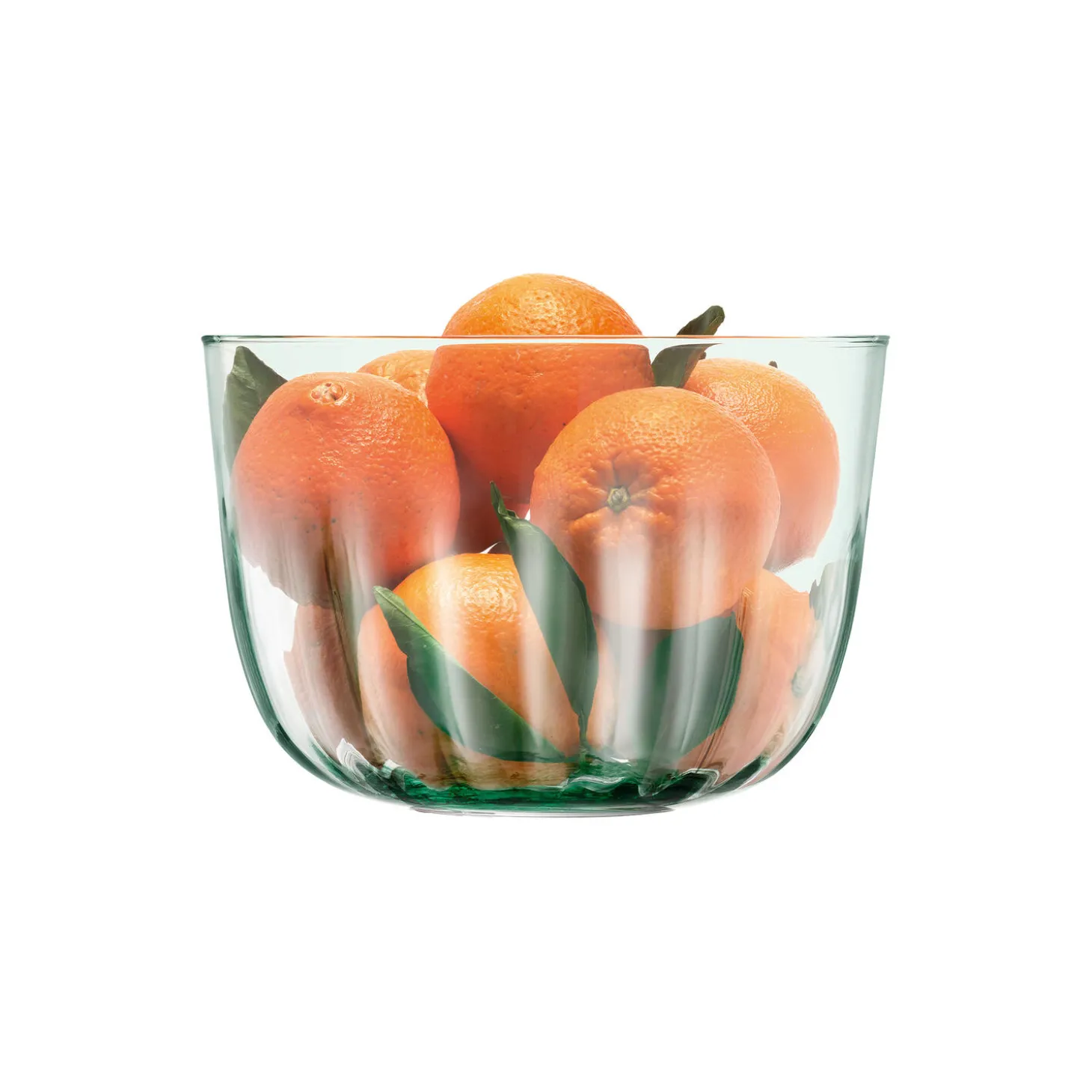 En stor dyb skål med en diskret riflet tekstur. Mundblæst af 100 % genbrugsglas, glasset har en subtil grøn nuance med et par luftbobler til stede, karakteristisk for den håndlavede proces. Til servering af salat eller fremvisning af frugt.