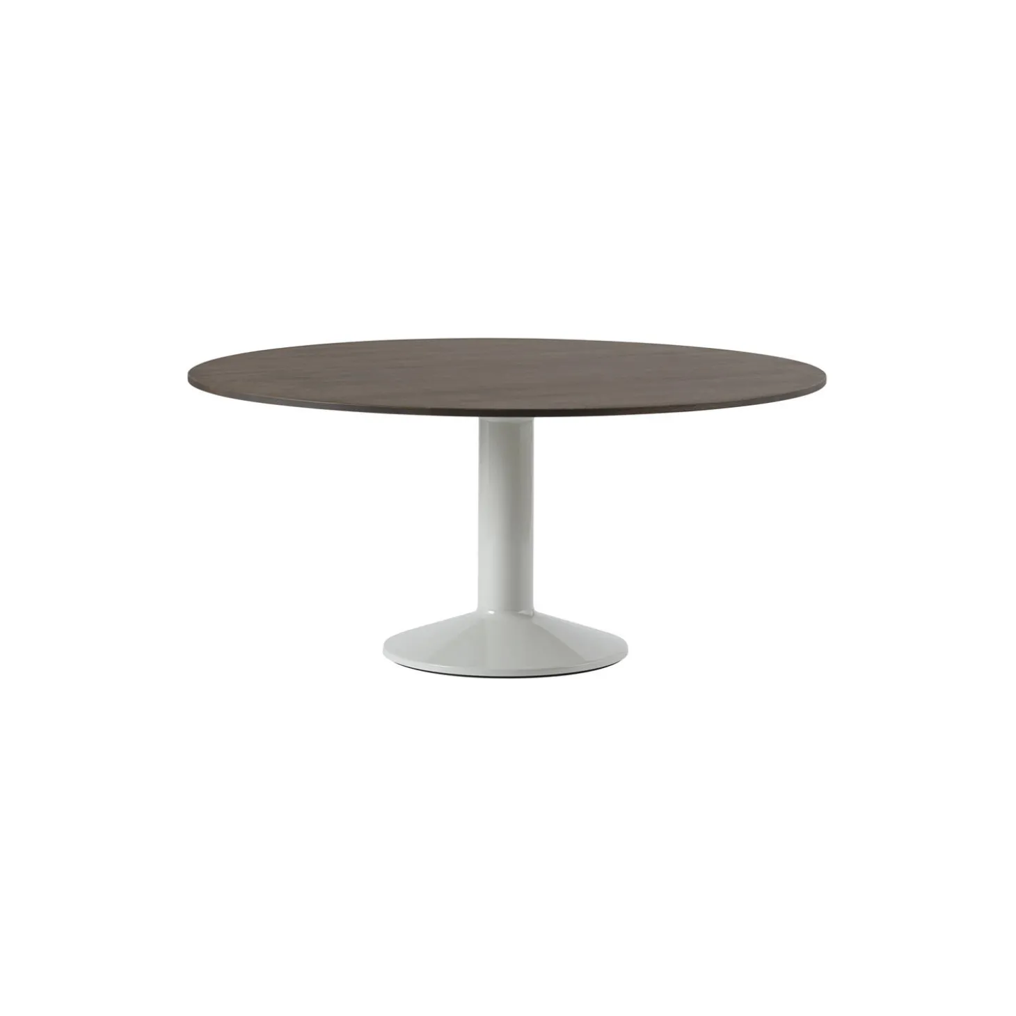 Midst Table from Muuto. A natural focal point of the home, the Midst Table is a generous, round dining table where friends and family gather — and there is always room to squeeze in one more guest. Its refined silhouette is simple yet characteristic, enhanced by distinct detailing and contrasting materiality; matte solid oak or linoleum on a monolithic base made of spun steel with a durable high gloss finish.