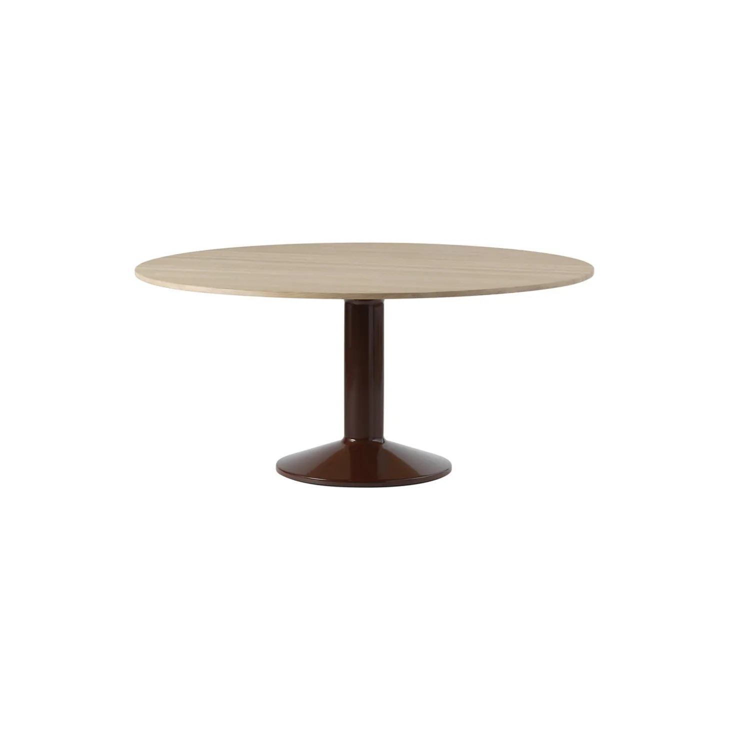 Midst Table from Muuto. A natural focal point of the home, the Midst Table is a generous, round dining table where friends and family gather — and there is always room to squeeze in one more guest. Its refined silhouette is simple yet characteristic, enhanced by distinct detailing and contrasting materiality; matte solid oak or linoleum on a monolithic base made of spun steel with a durable high gloss finish.