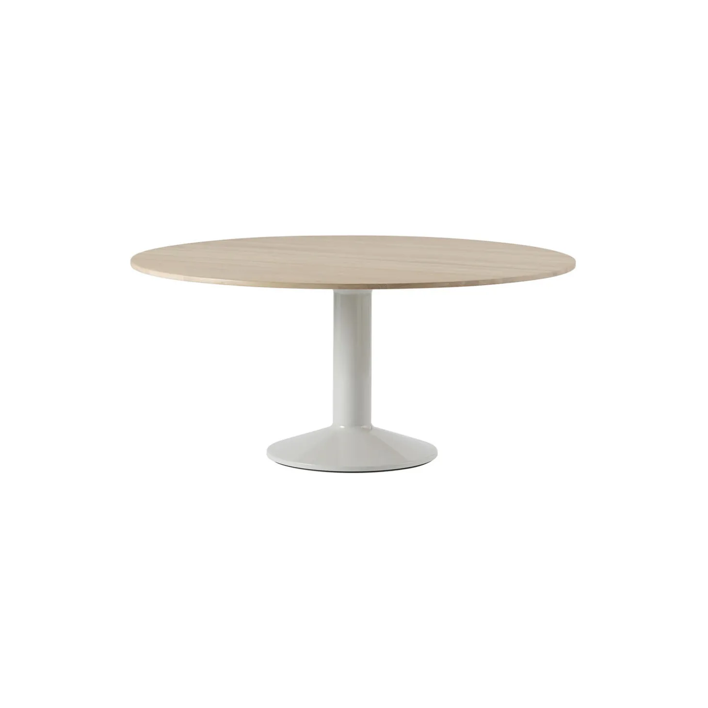 Midst Table from Muuto. A natural focal point of the home, the Midst Table is a generous, round dining table where friends and family gather — and there is always room to squeeze in one more guest. Its refined silhouette is simple yet characteristic, enhanced by distinct detailing and contrasting materiality; matte solid oak or linoleum on a monolithic base made of spun steel with a durable high gloss finish.