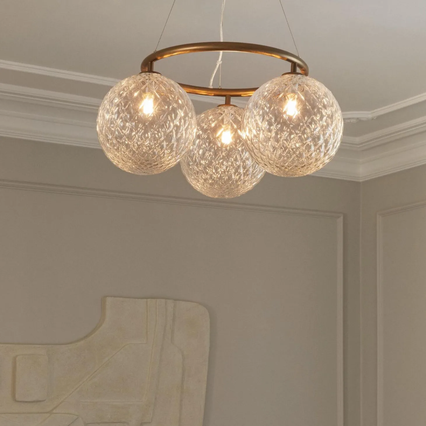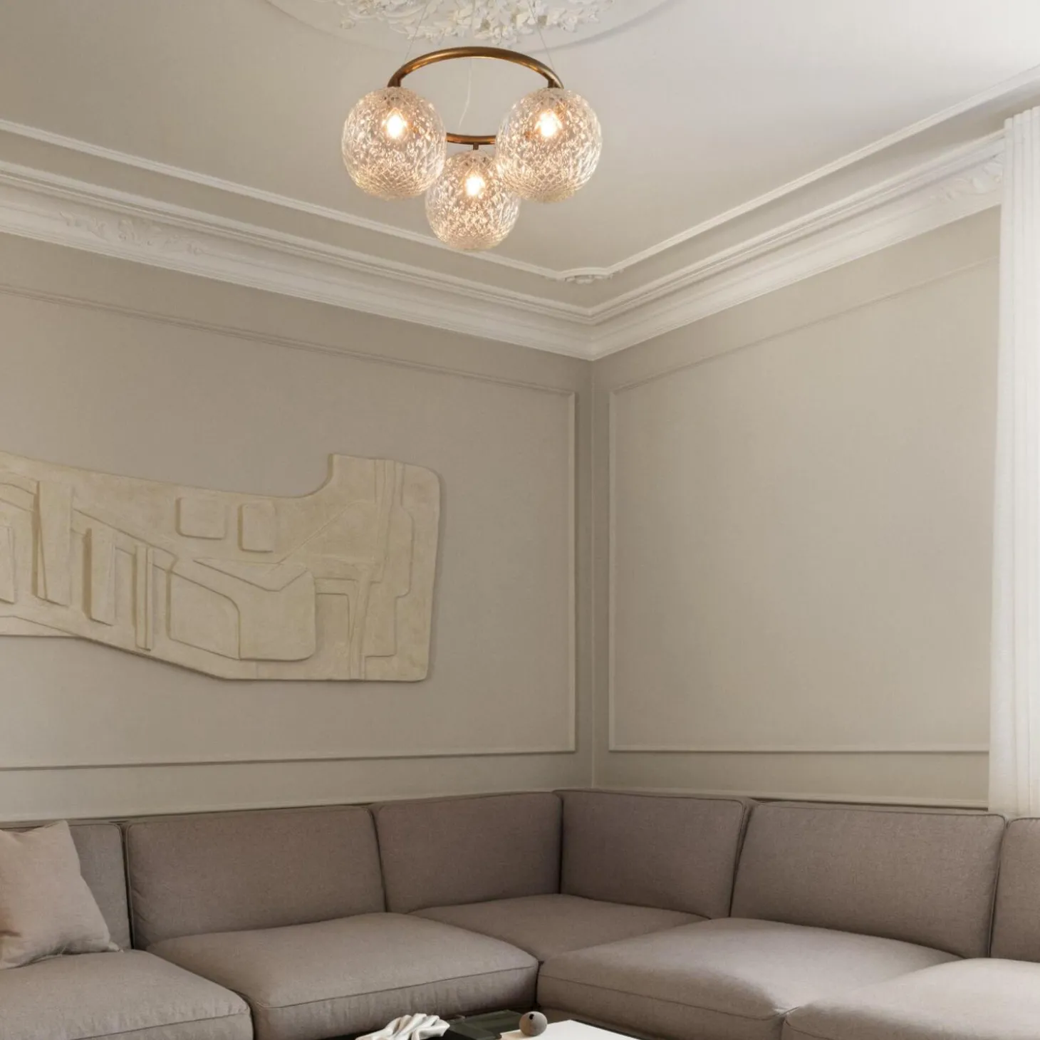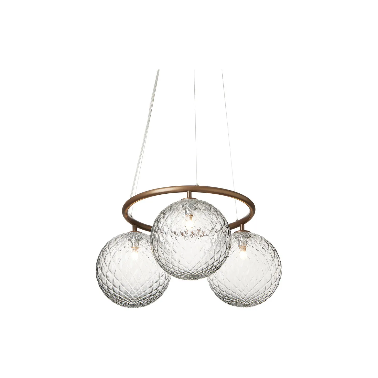 Miira 3 Circular har et klassisk udtryk og er designet til at hænge lavt eller højt fra loftet. Den runde ringkrone er udført i en mørk bronze pulverlakering, hvorfra tre store mundblæste skærme i optisk klart glas er monteret og står fremhævet i forhold til metalringens beskedne størrelse. Miira 3 Circular er velegnet som et centerpiece over fx et sofaarrangement i stuen, hvor de optiske glaskugler spreder et funklende lys.