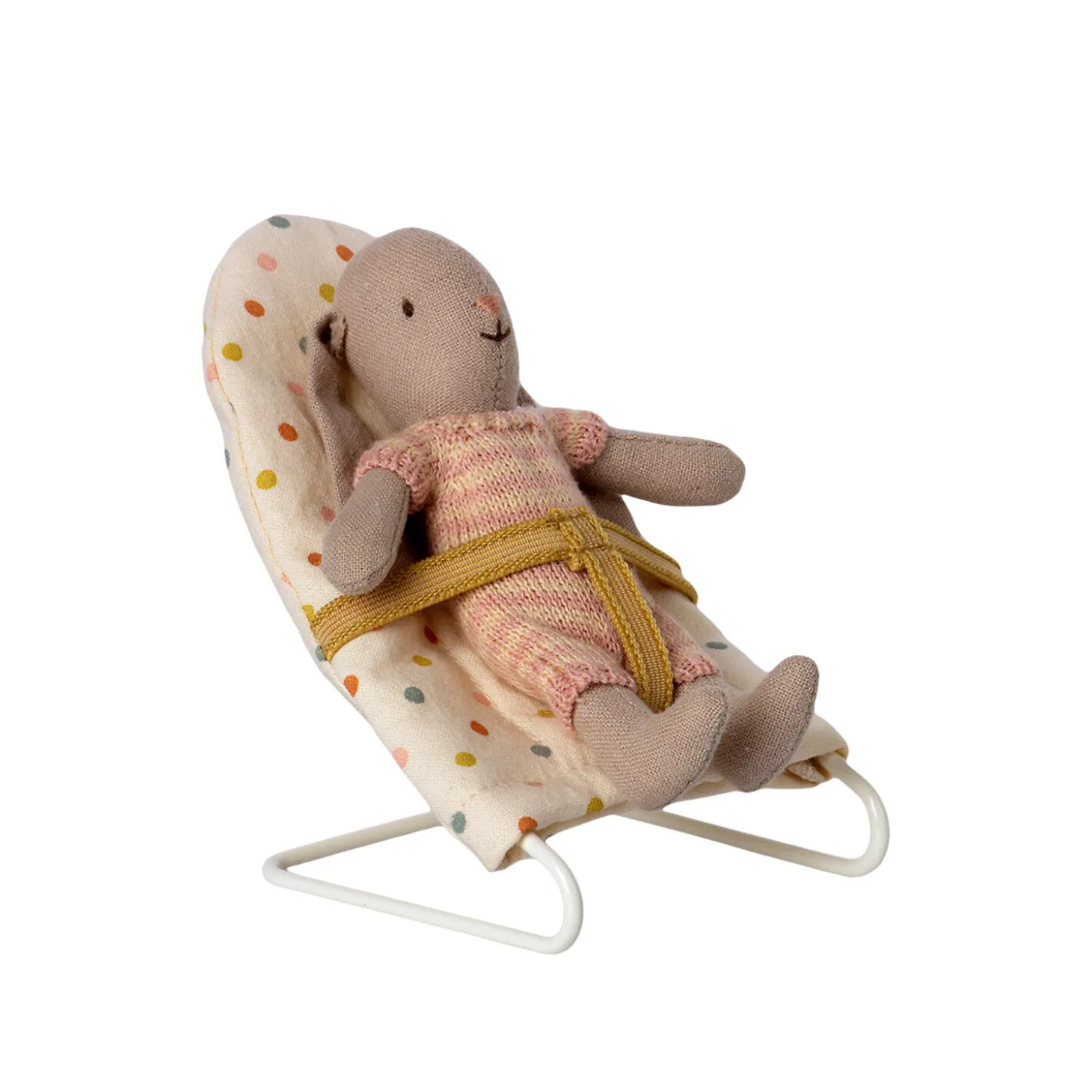 Med denne skråstol passer du godt på dine små venner. Basen er lavet af metal og stoffet er unikt Maileg print. Stolen passer til babymus såvel som kaniner og harer i størrelsen mikro.