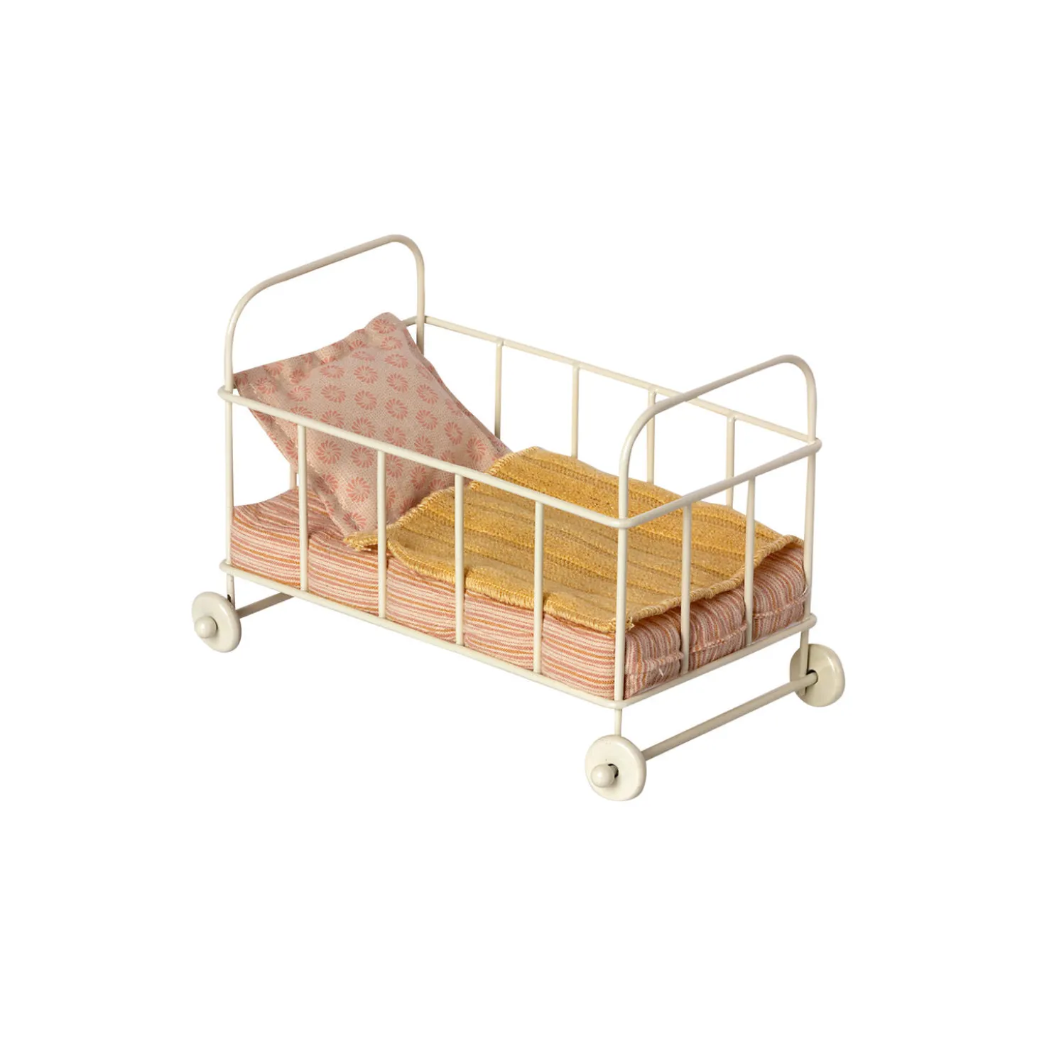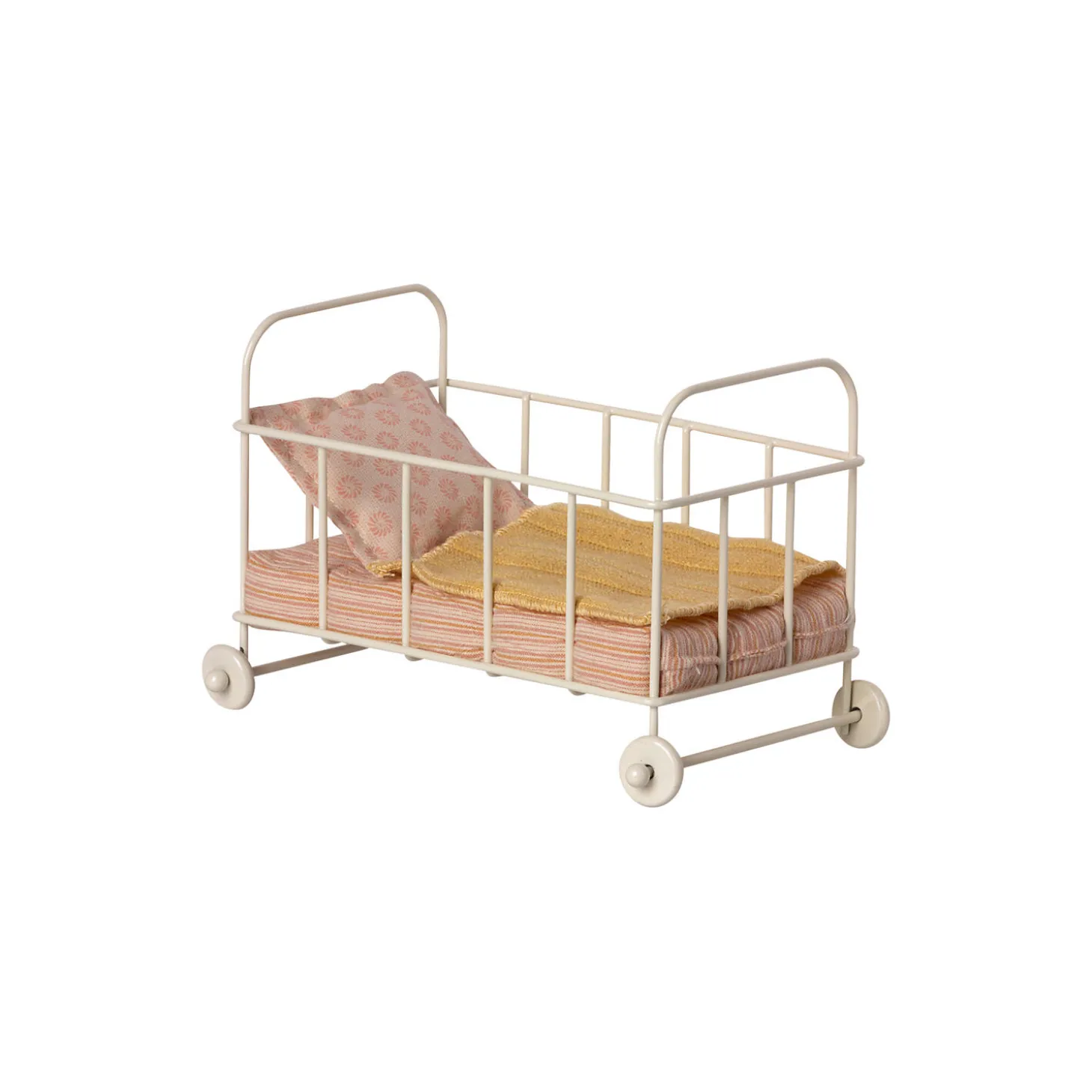 En hyggelig tremmeseng lavet af metal. Den leveres med en tyk madras og pude lavet i unikke Maileg tekstiler. Ovenpå holder et strikket tæppe de små venner varme. Her kan du putte dine venner i størrelse mikro og baby mus.