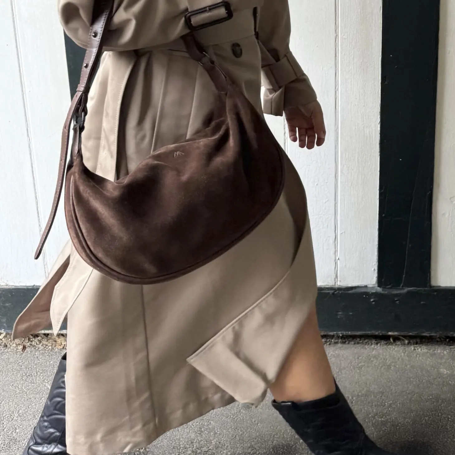 Opdag Mini Muse i Suede fra Markberg. En smuk og stilrent taske, der kombinerer trend, funktionalitet og tidløs elegance. Fremstillet af 100% kalveskind med fokus på zero waste, er denne taske en ægte designperle. I denne sæson er suede i centrum og denne taske er en del af vores nye udvalg af “it-bags”. Den elegante taske er designet med både et kort håndtag og en lang crossbody rem i læder, så du kan bære den, lige som det passer dig, til hverdag eller fest. Remmen udskiftes ved at åbne ringene i begge sider, hvorefter læderstroppen kan fjernes og udskiftes. Indvendigt finder du et rummeligt hoved rum, der har plads til alt, du behøver på farten, samt en lille lynlåslomme til værdigenstande. Taskens for er i 100% bomuld, hvilket giver et lækkert og holdbart finish. Med sine mål på 16 cm x 28 cm x 7 cm er denne taske den perfekte kombination af funktionalitet og stil, en ægte must-have, der vil følge dig i mange år fremover.