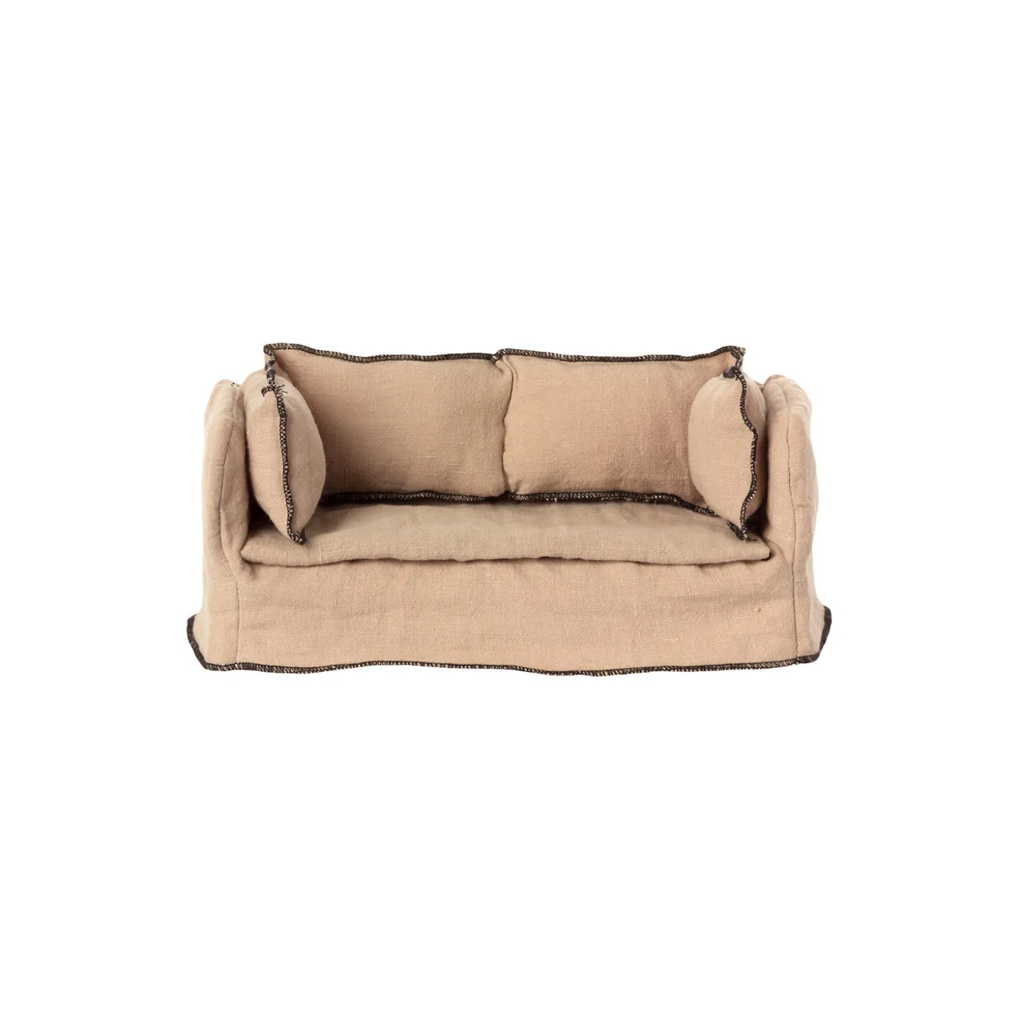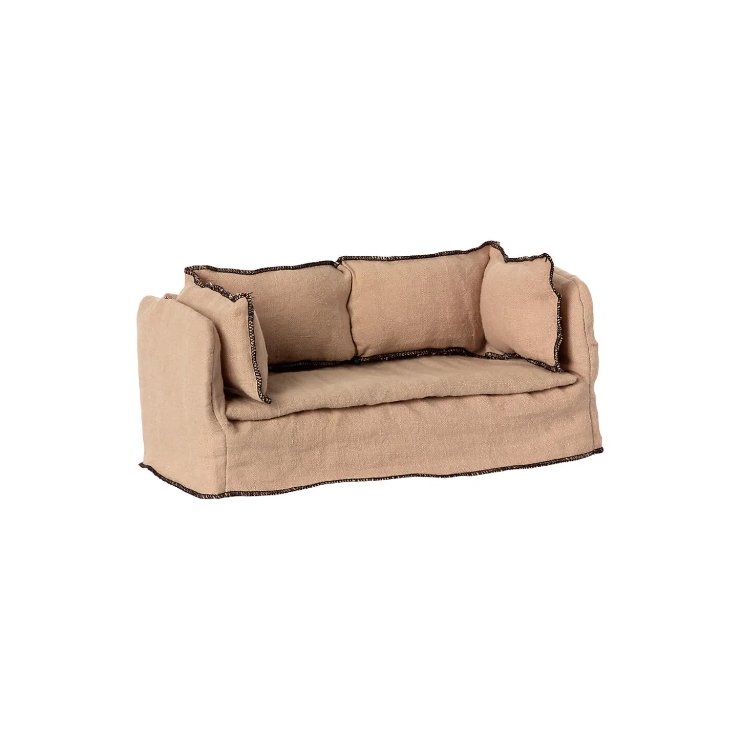 Tag en pause på denne dejlige sofa. Den har en base af træ og har et blødt betræk lavet i hørkvalitet. Match det med sofabordet, og det passer perfekt ind i Maileg dukkehuset.