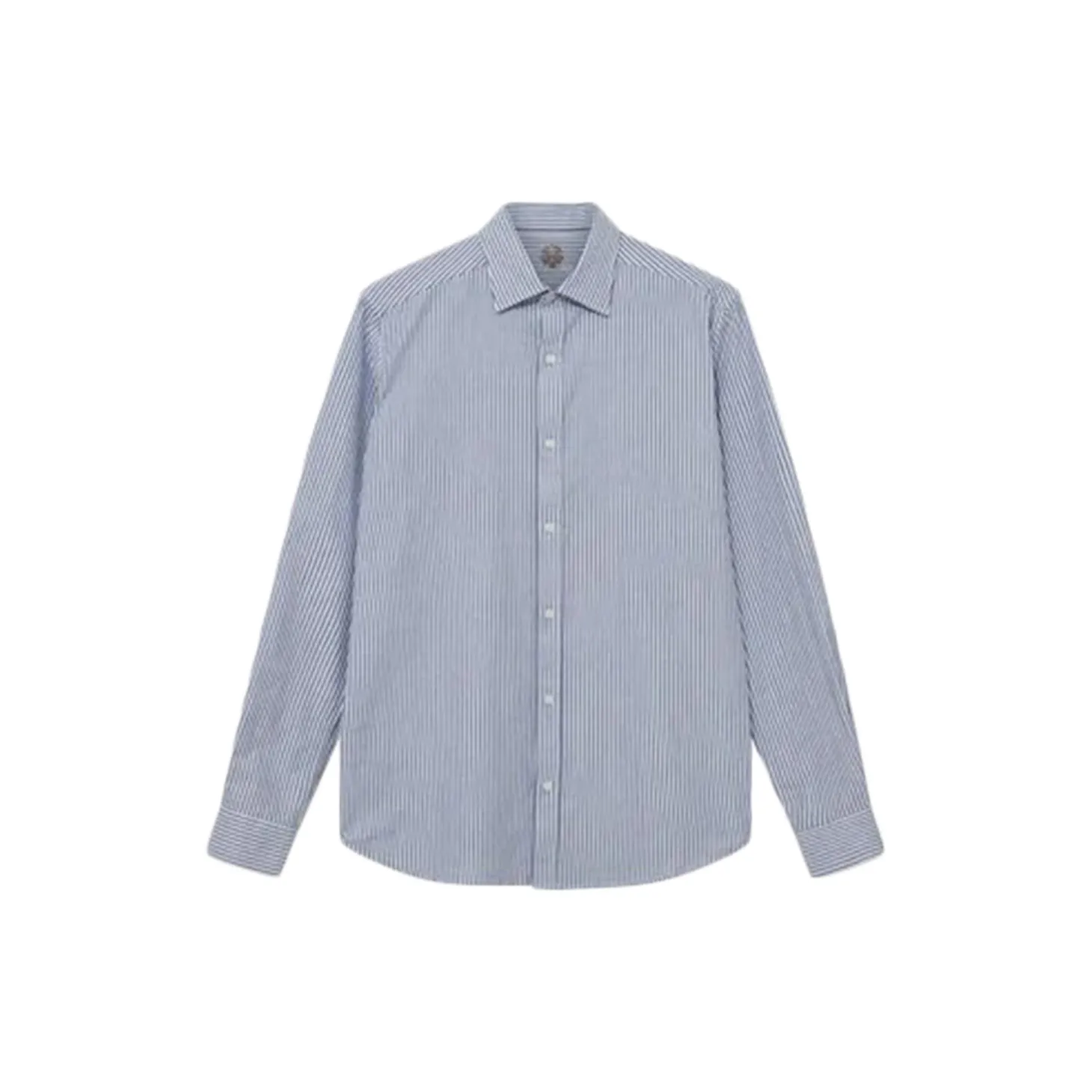 En raffineret udgave af en tidløs basisvare. Denne stribede skjorte er skåret i en almindelig pasform med en skarp klassisk krave og lange ærmer, afsluttet med knappede manchetter. Det er subtilt, men alligevel sofistikeret, og det er den slags stykke, der fungerer lige så godt i lag under ta