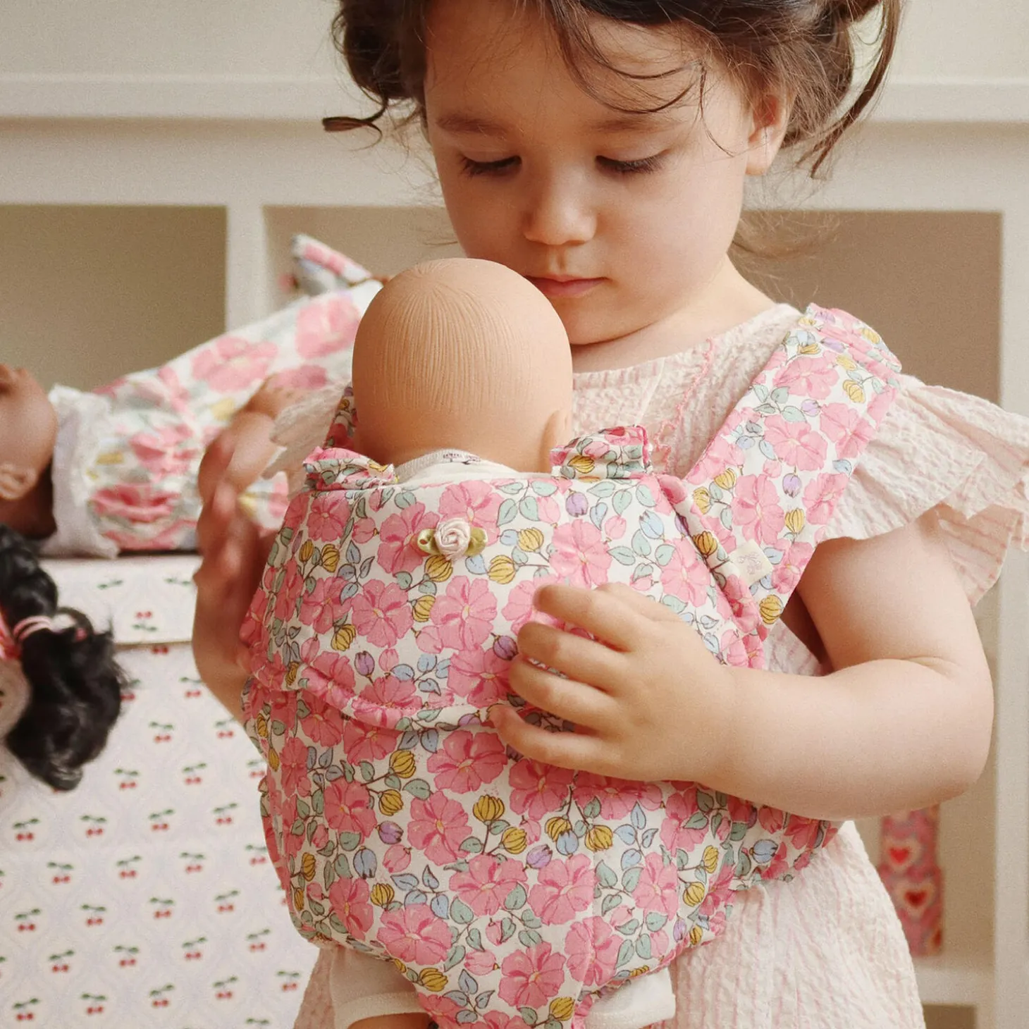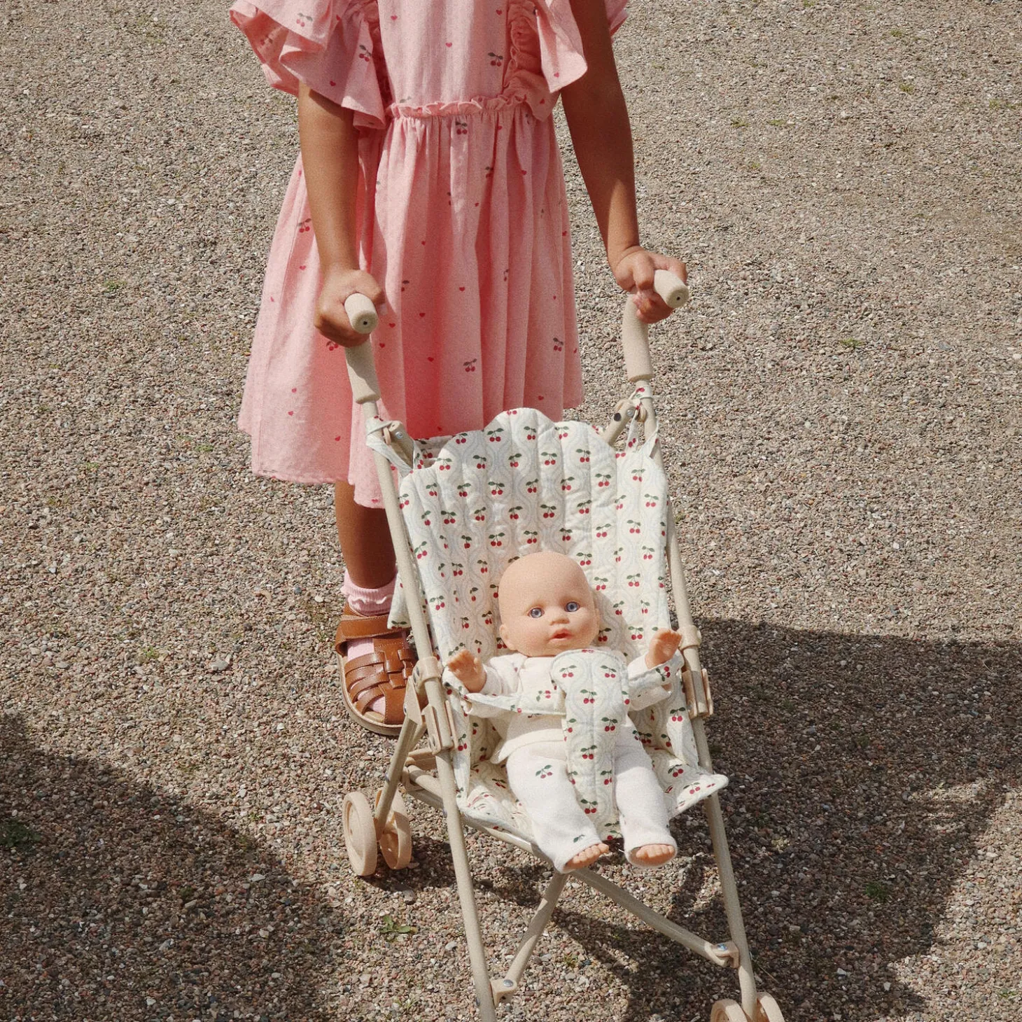 Soft and cuddly doll dressed in a cute organic cotton set with a blouse and pants. Easy for the child to put on and take off. Includes a pacifier to gently soothe the doll with.