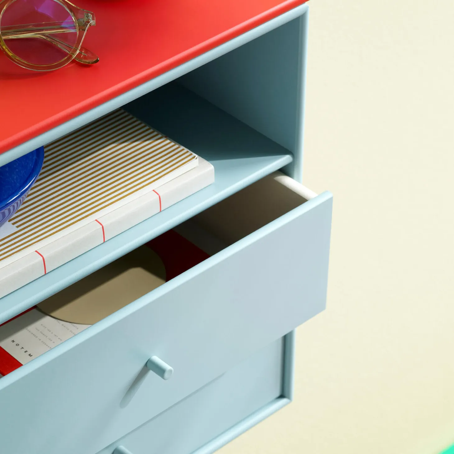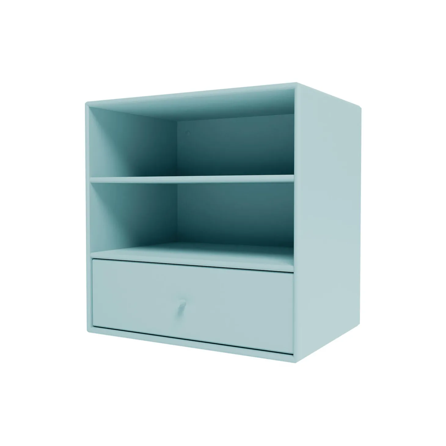 Denne Montana Mini har hylder og én skuffebakke. Skuffebakken hviler på hylden under, og kan flyttes ind i hvilket som helst af de tre rum. Modulet kan yderligere anvendes med eller uden skuffebakken. Skuffebakken er hvid og har en lakeret front i samme farve som selve modulet.