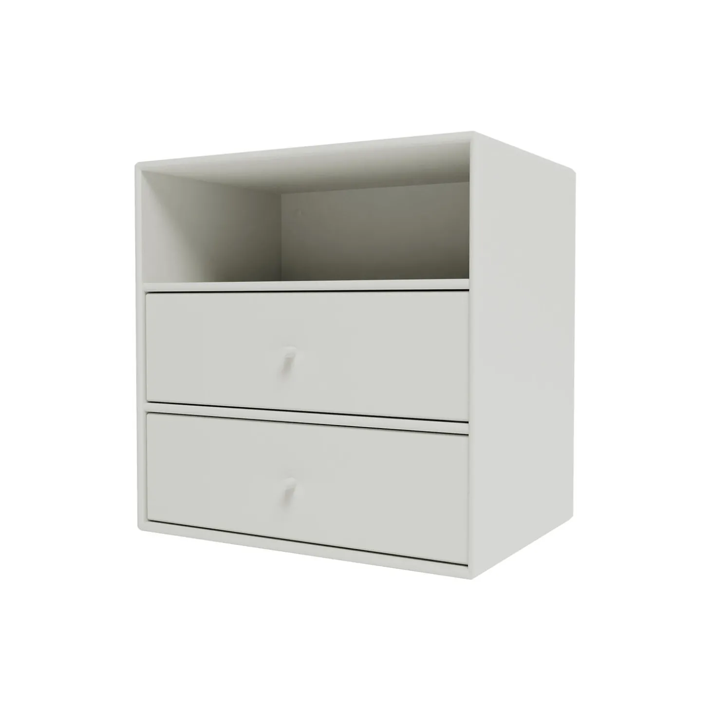 Montana Mini med hylder og to skuffebakker. Skuffebakkerne kan trækkes helt ud af modulet og passer ind i alle tre rum. Modulet kan ydermere anvendes med eller uden skuffebakkerne. Skuffebakken er hvid og har en front lakeret i samme farve som selve modulet.