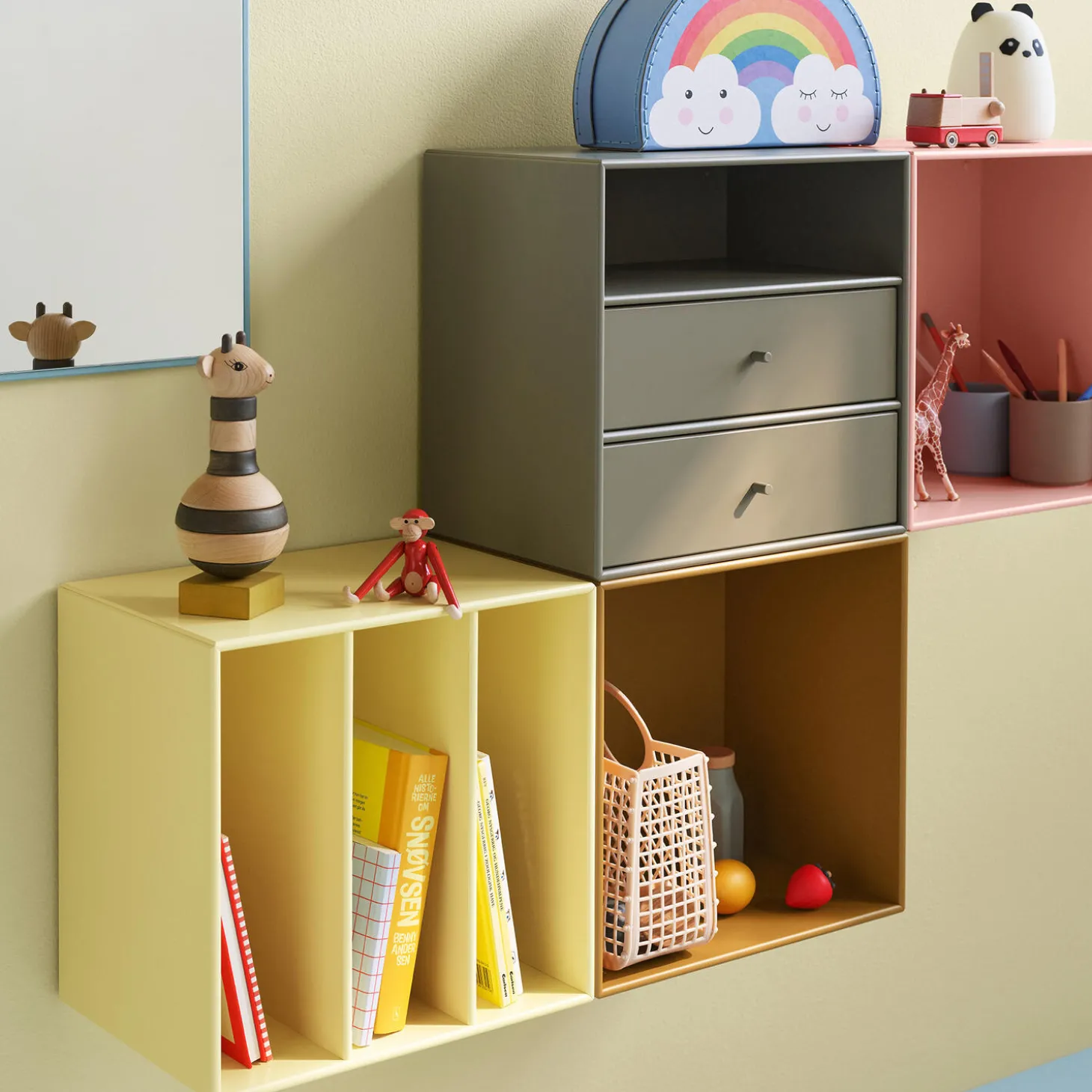 Montana Mini med hylder og to skuffebakker. Skuffebakkerne kan trækkes helt ud af modulet og passer ind i alle tre rum. Modulet kan ydermere anvendes med eller uden skuffebakkerne. Skuffebakken er hvid og har en front lakeret i samme farve som selve modulet.