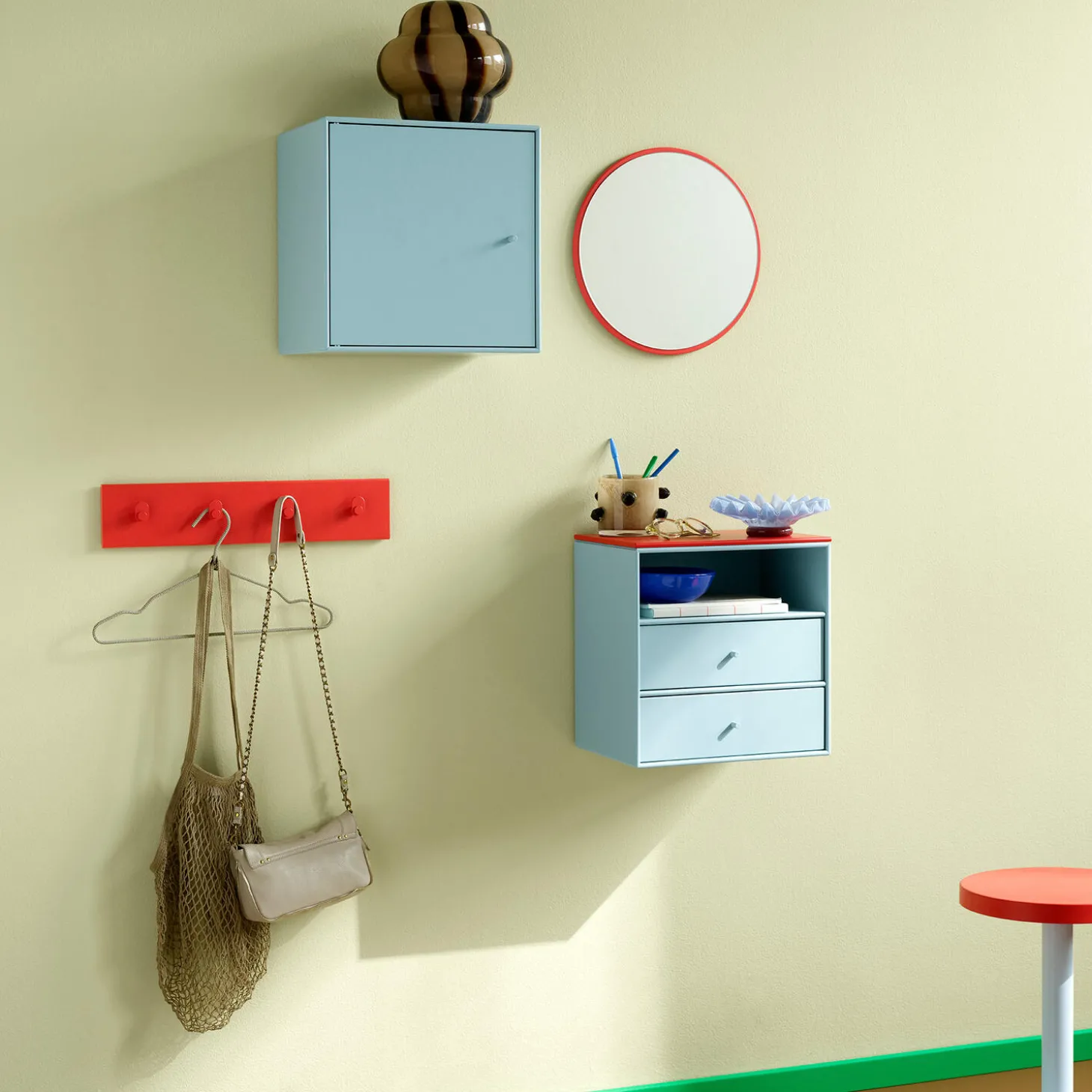 Det runde Montana Mini spejl er placeret på en 8 mm lakeret mdf-plade. Med spejlet kan du tilføre Montana Mini modulerne nye funktioner og skabe et legende og foranderligt udtryk.