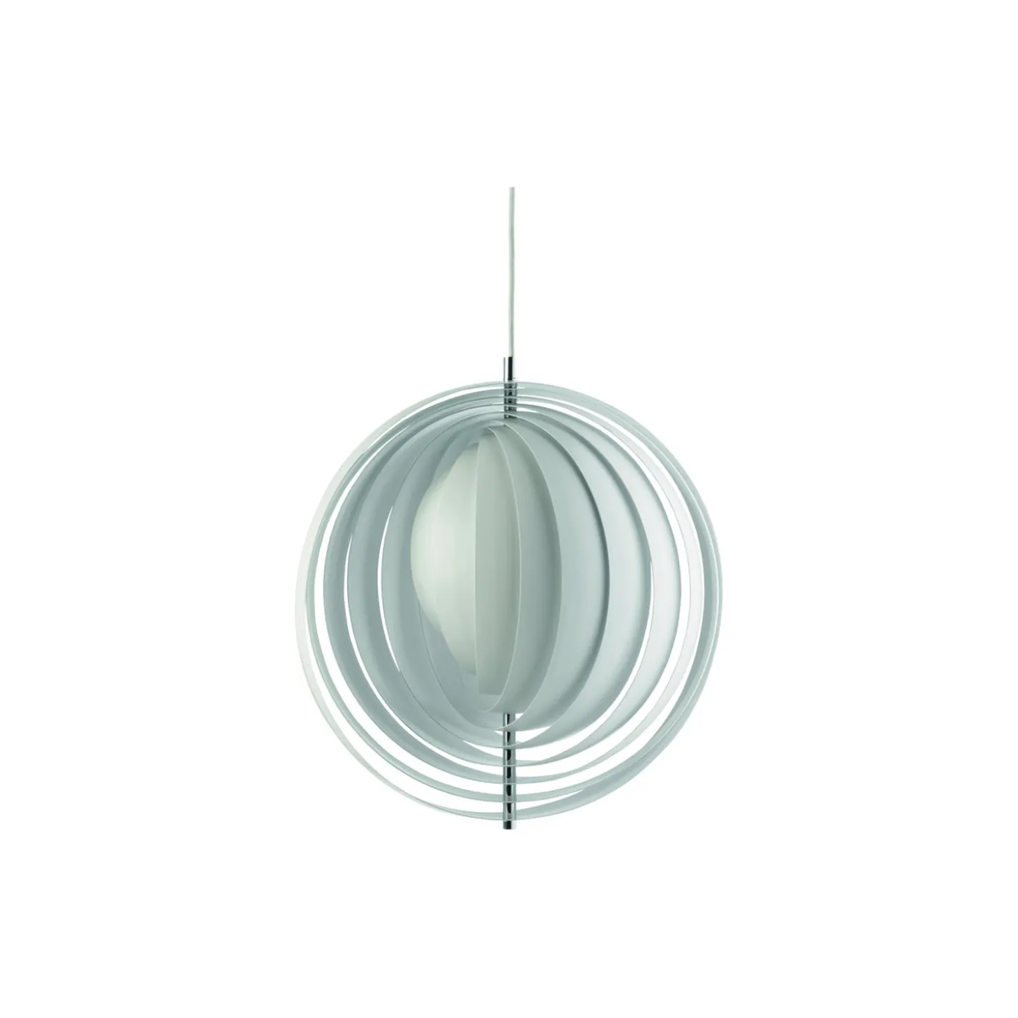 Moon pendel med lameller i lakeret metal fra Verpan. Farve: hvid. Mål: Ø 44,5 cm. Lyskilde: maks. 60W E27. Design: Verner Panton.