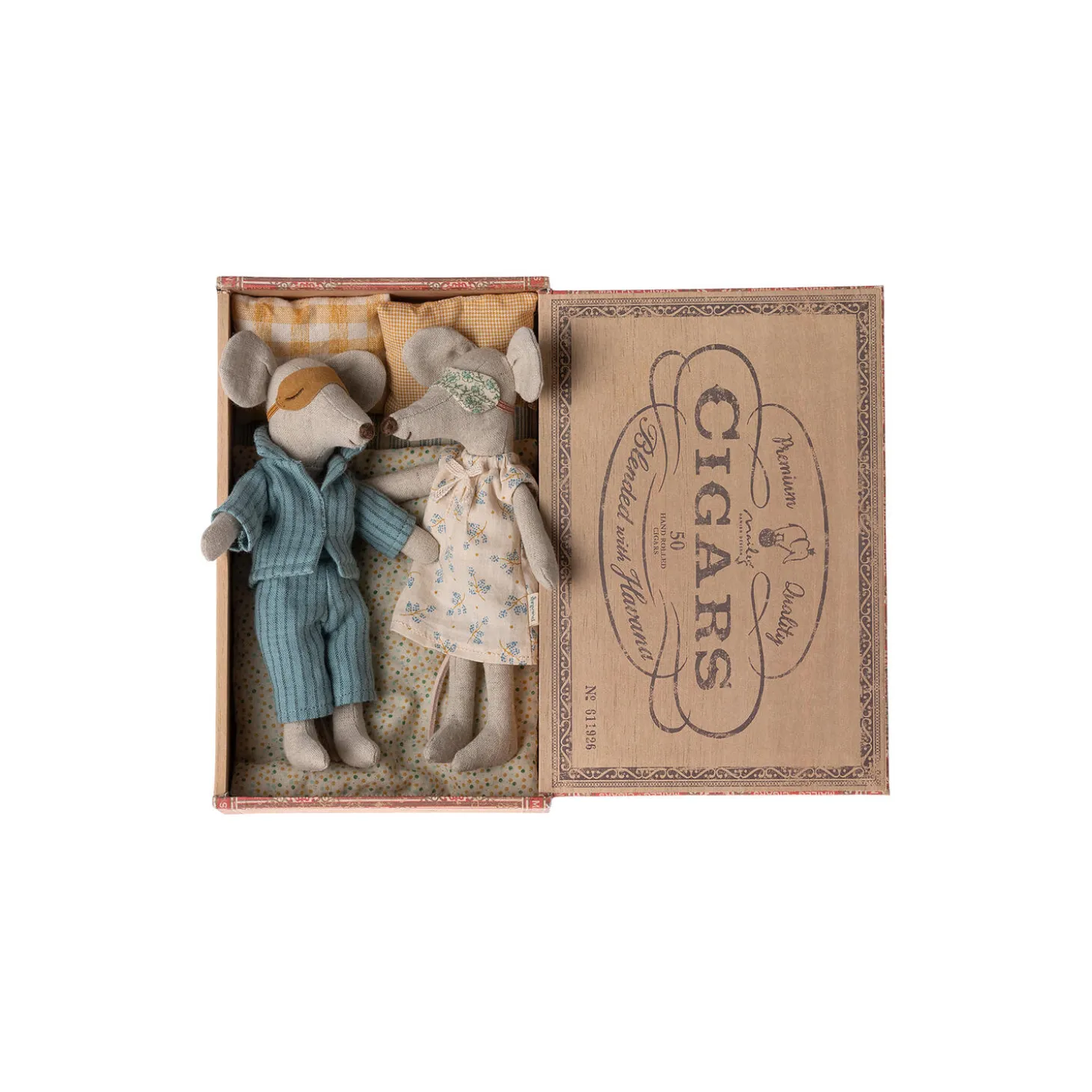 En klassisk Maileg vare. Mor og far mus har deres smukke nattøj og sovemasker på. Cigaræsken er en perfekt seng til en god nats søvn og søde drømme. Sengetøj kan variere i farve.