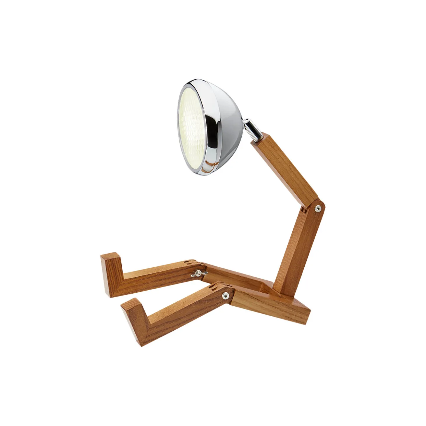 He is a handmade LED lamp. Not factory made – HAND made. He’s proud of this fact and hopes you are proud of him. His body is ash wood and his head is inspired by the 1946 Vespa headlight. It’s what’s made him so famous. Oh… and he has very flexible joints that help him shift focus quickly, but you’ll figure that out soon enough. “Okay, can we go home now?”